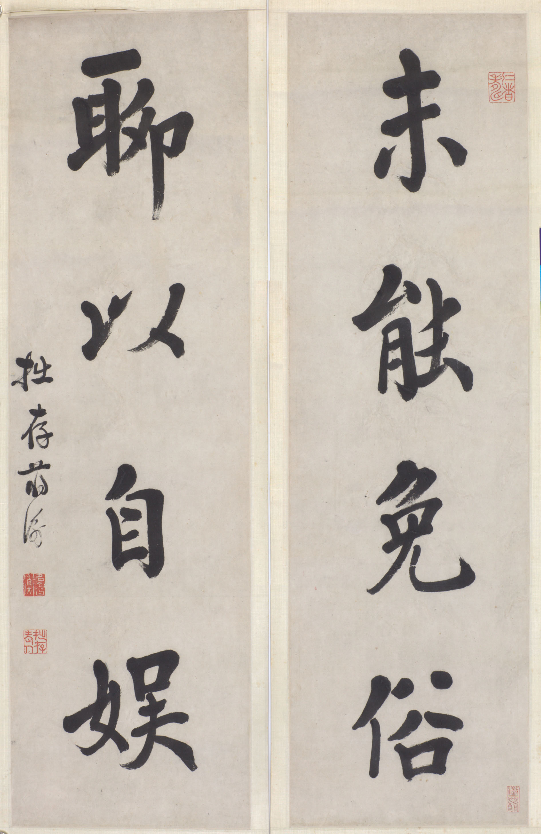 蒋衡《行楷四言联》 88×26cm×2 无锡博物院藏 释文:未能免俗,聊以自慰。 款识:拙存蒋衡。 钤印:名余曰衡(白文)、拙存老人(朱文)、仁者寿(朱文)、澄怀馆(朱文) 【资料来源】无锡博物院