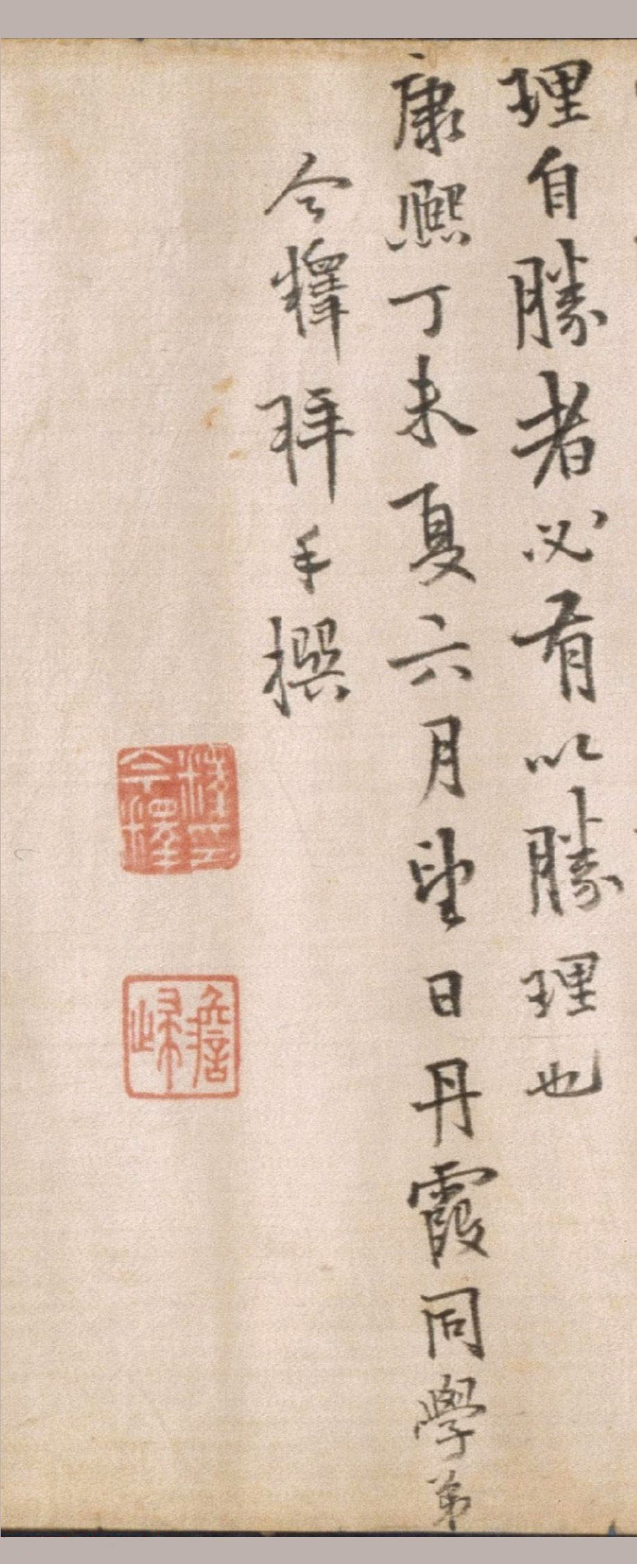 释今释《元诚道人传》纸本行楷书局部 款识:康熙丁未夏六月望日丹霞同学弟今释拜手撰 钤印:释今释印(白文)、澹归(朱文)