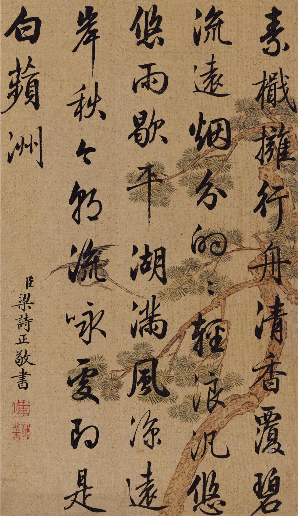 释文:素楫拥行舟,清香覆碧流。远烟分的的,轻浪泛悠悠。雨歇平湖满,风凉远岸秋。今朝流咏处,即是白苹洲。 款署:臣梁诗正敬书。 钤印:诗正·敬业 说明:此幅书于清宫手绘库绢。 拍卖日期: 2019-06-04 下午2:00 估价: RMB 50,000-80,000