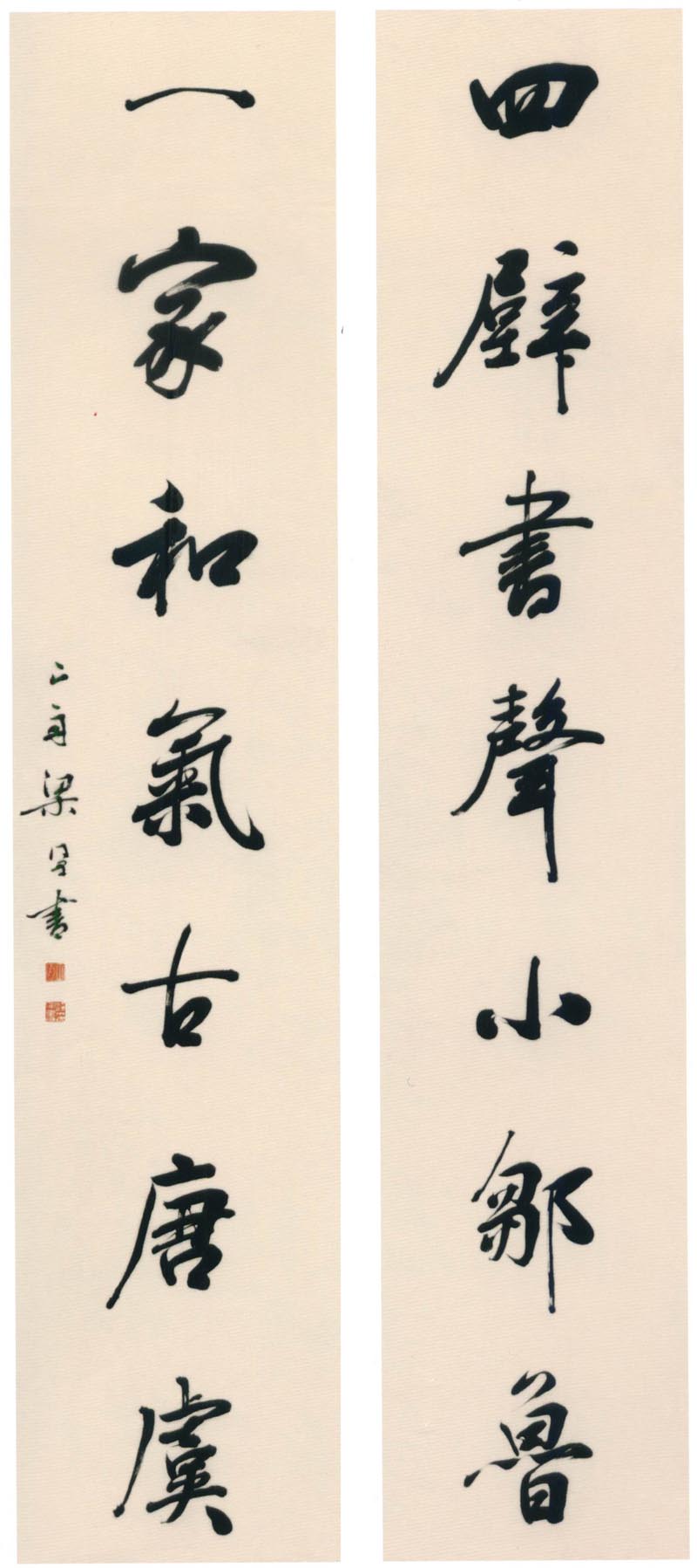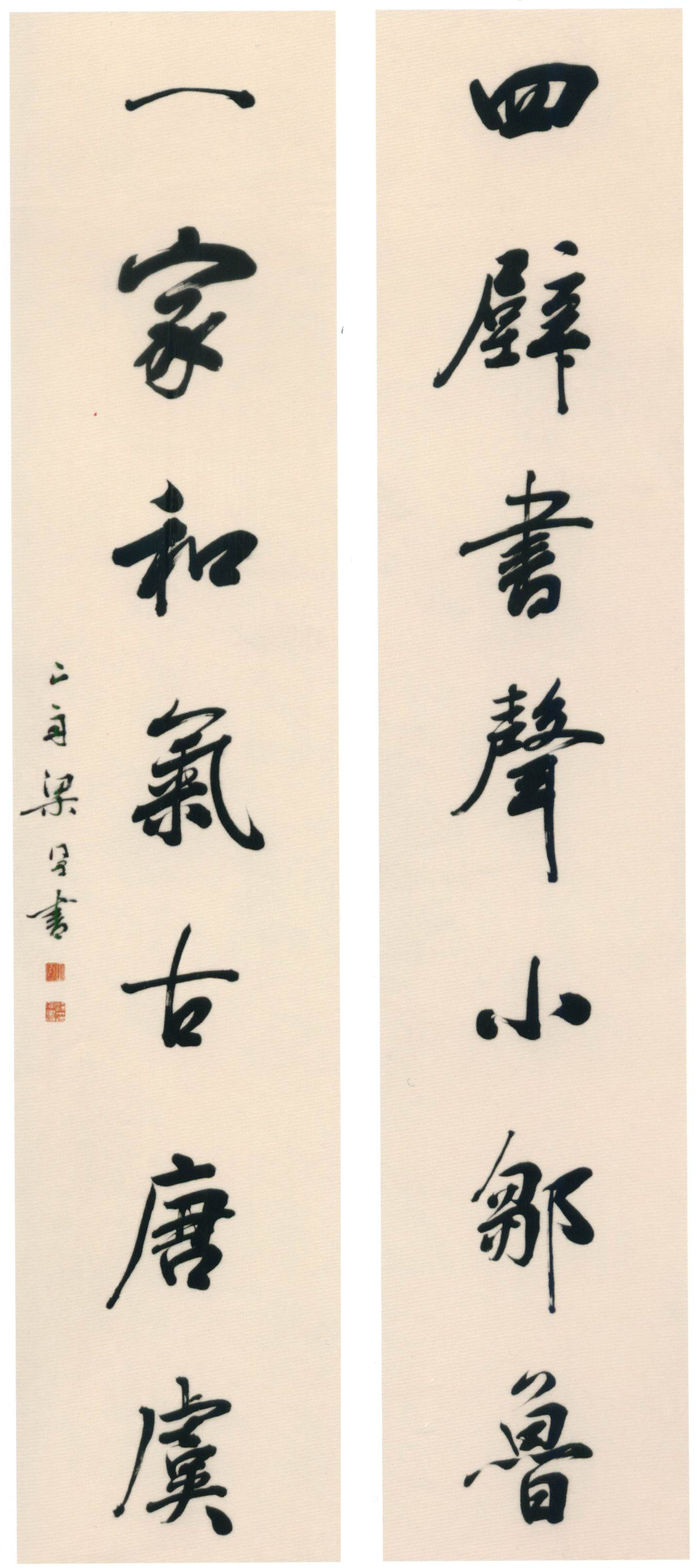 梁同书《行书四壁一家七言联》 纸本行书 128.5×28cm×2 常州市博物馆藏 释文:四壁书声小邹鲁,一家和气古唐虞。 款署:山舟梁同书。