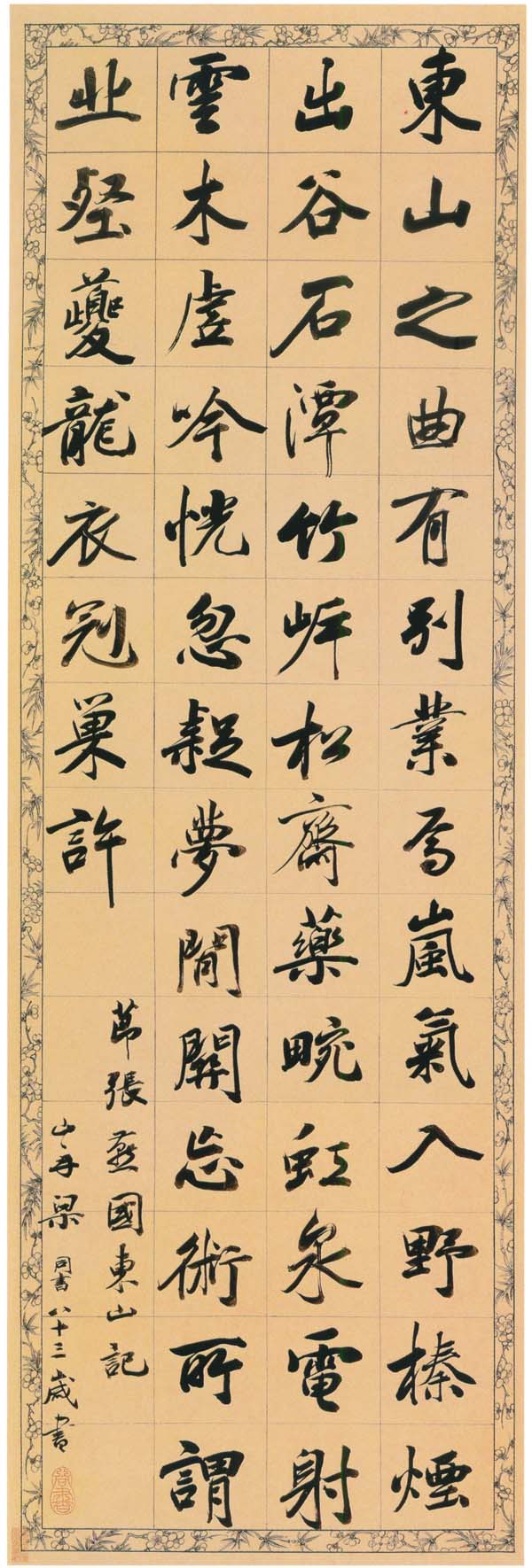 梁同书《行书节录张燕国东山记轴》 纸本行书 133.5×43.8cm 上海博物馆藏 释文:东山之曲,有别业焉。岚气入野,榛烟出谷,石潭竹岸,松斋药畹。虹泉电射,云木虚吟,恍惚疑梦,闲关忘术。所谓丘壑夔龙,衣冠巢许。 款署:节录张燕国东山记。山舟梁同书八十三岁书。