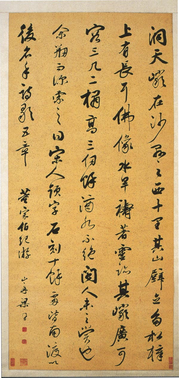 梁同书《行书节录董宗伯纪游轴》纸本行书 128.5×59cm 湖南省博物馆藏 释文:洞天岩在沙县之西十里。其山壁立,多松樟,上有长耳佛像,水旱祷著灵迹。其岩广可容三几二榻,高三仞余,滴水不绝。闽人未知赏也。余创而深索之。得宋人题字石刻十余处,皆南渡以后名手,诗歌五章。 款署:董宗伯纪游,山舟梁同书。 钤印:山舟、梁同书印。