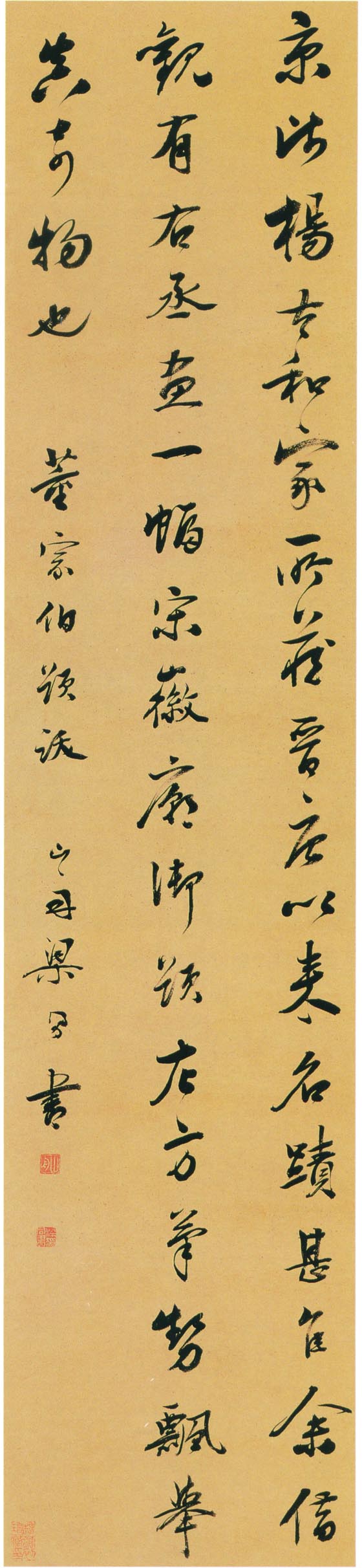 梁同书《行书节录董其昌题跋轴》纸本行书 127.1×28.6cm 上海博物馆藏 释文:京师杨太和家,所藏晋唐以来名迹甚佳。余借观有右丞画一幅。宋徽庙御题左方,笔势飘举,真奇物也。 款署:董宗伯题跋,山舟梁同书书。 钤印:山舟、梁同书印。