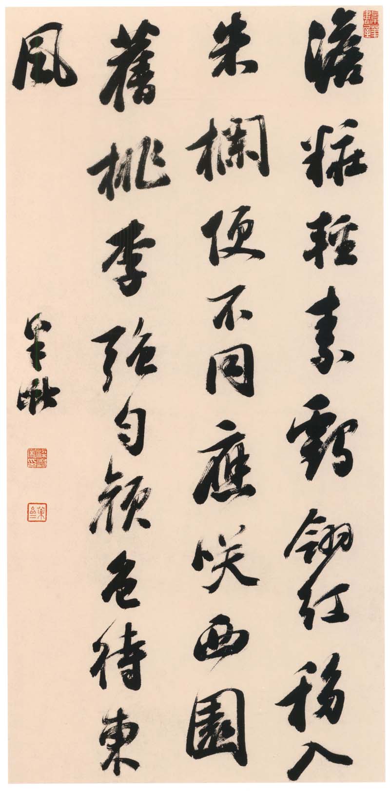 梁巘《行书七绝诗轴》纸本行书 117×56.5cm 北京故宫博物院藏 释文:淡妆轻素鹤翎红,移入朱栏便不同。应笑西园桃与李,强匀颜色待东风。 款署:梁巘。 钤印:梁巘私印(白文)、松斋(朱文)、景华书屋(白文) 【资料来源】《中国法书全集》-17-清-2 (文物出版社 可嘉扫描)