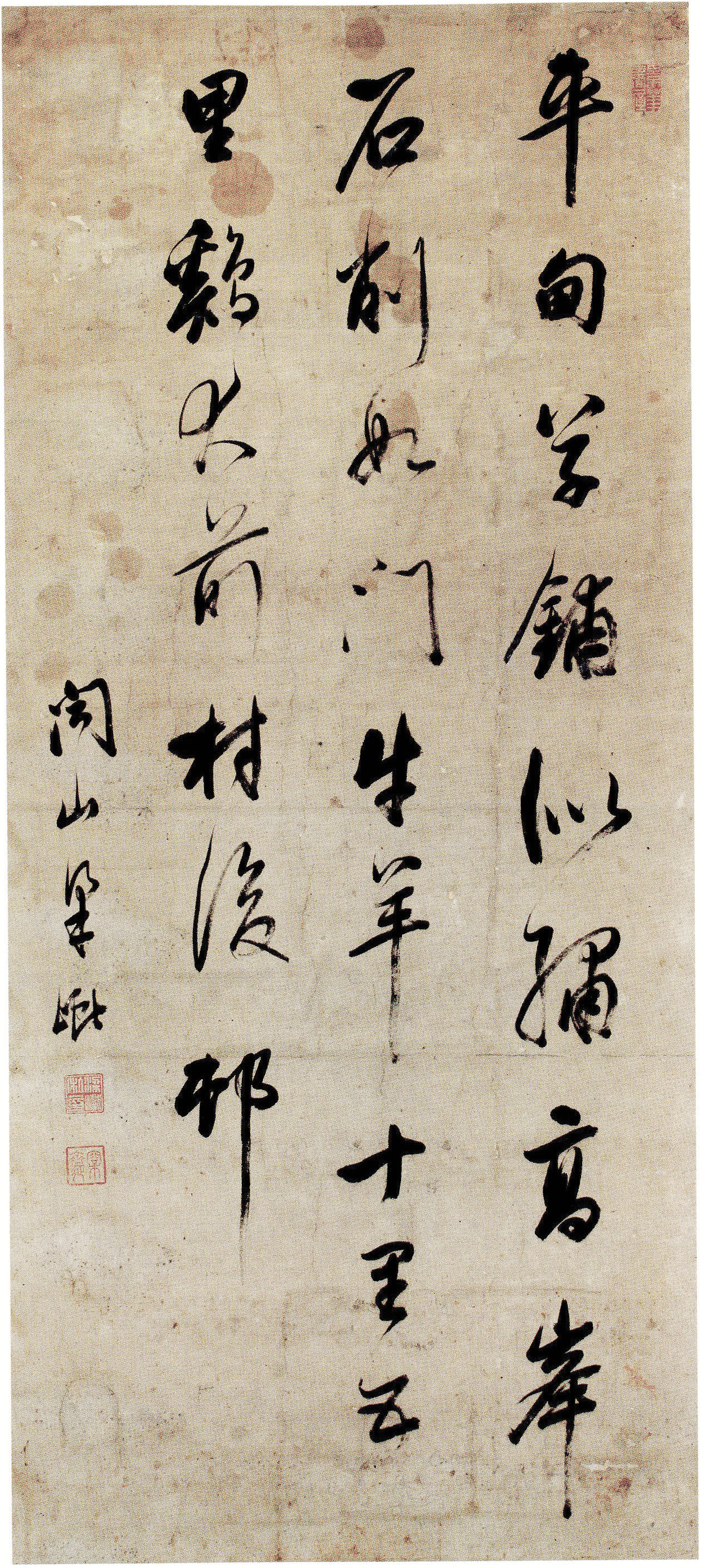 梁巘《行书明人六言诗轴》纸本行书 134×59cm 淮安市博物馆藏 释文:平甸草铺似绣,高峰石削如门,牛羊十里五里,鸡犬前村後村。 款署:闻山梁巘。 钤印:梁巘私印(白文)、松斋(朱文)、景华书屋(白文) 【资料来源】《淮安市博物馆藏明清书画精品集 》 (文物出版社)