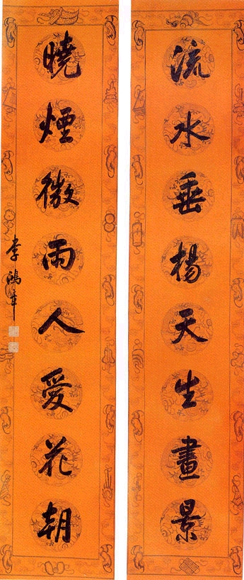 释文:流水垂杨天生画景,晓烟微雨人爱花朝。 款 识:李鸿章。 钤印:文华殿大学士(朱文)、李鸿章印(白文)
