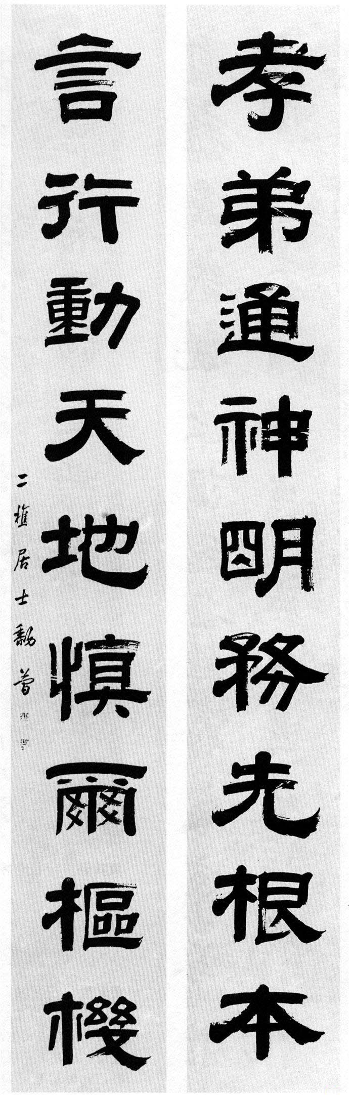 释文:孝弟通神明务先根本,言行动天地慎尔枢机。 款署:二樵居士黎简。