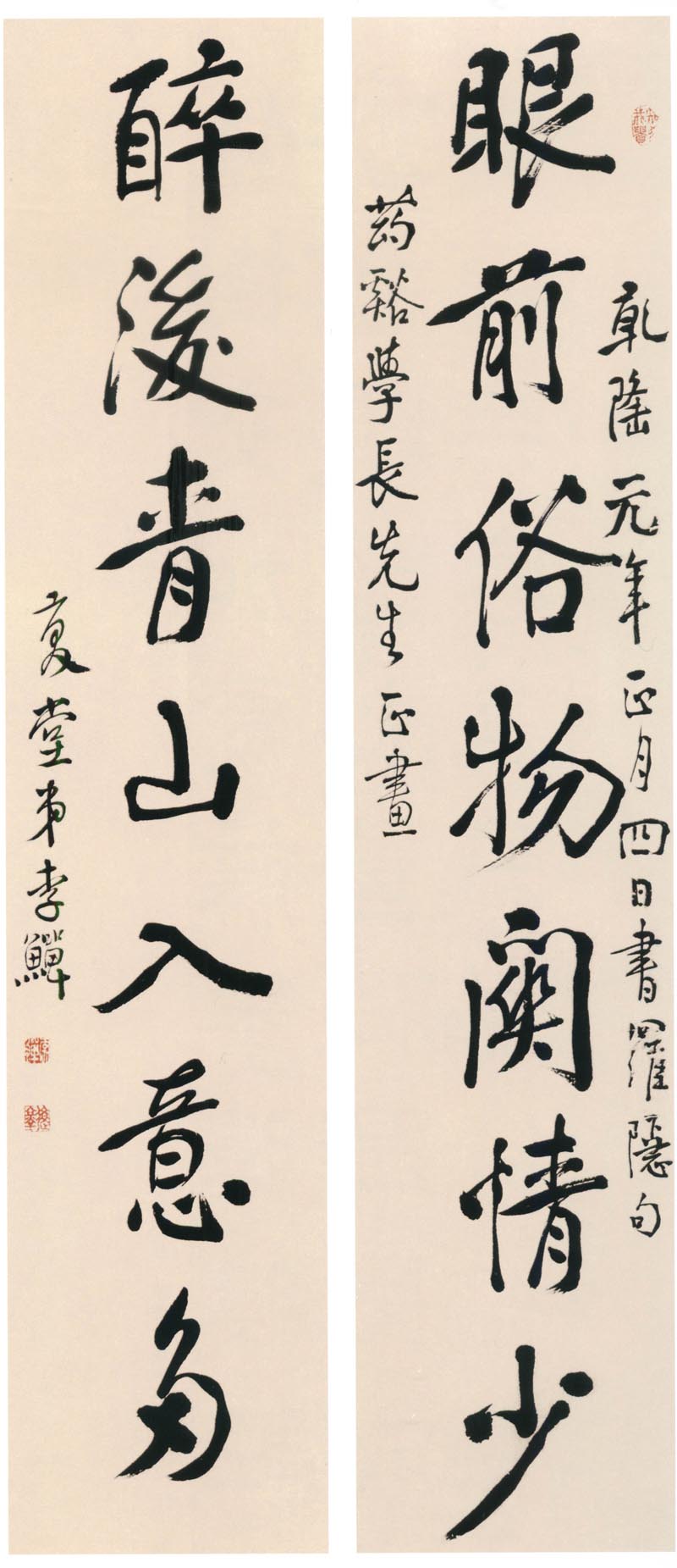 释文:眼前俗物关情少,醉后青山入意多。 款署:乾隆元年正月四日书罗隐句,药谿学长先生正画。复堂弟李鱓。