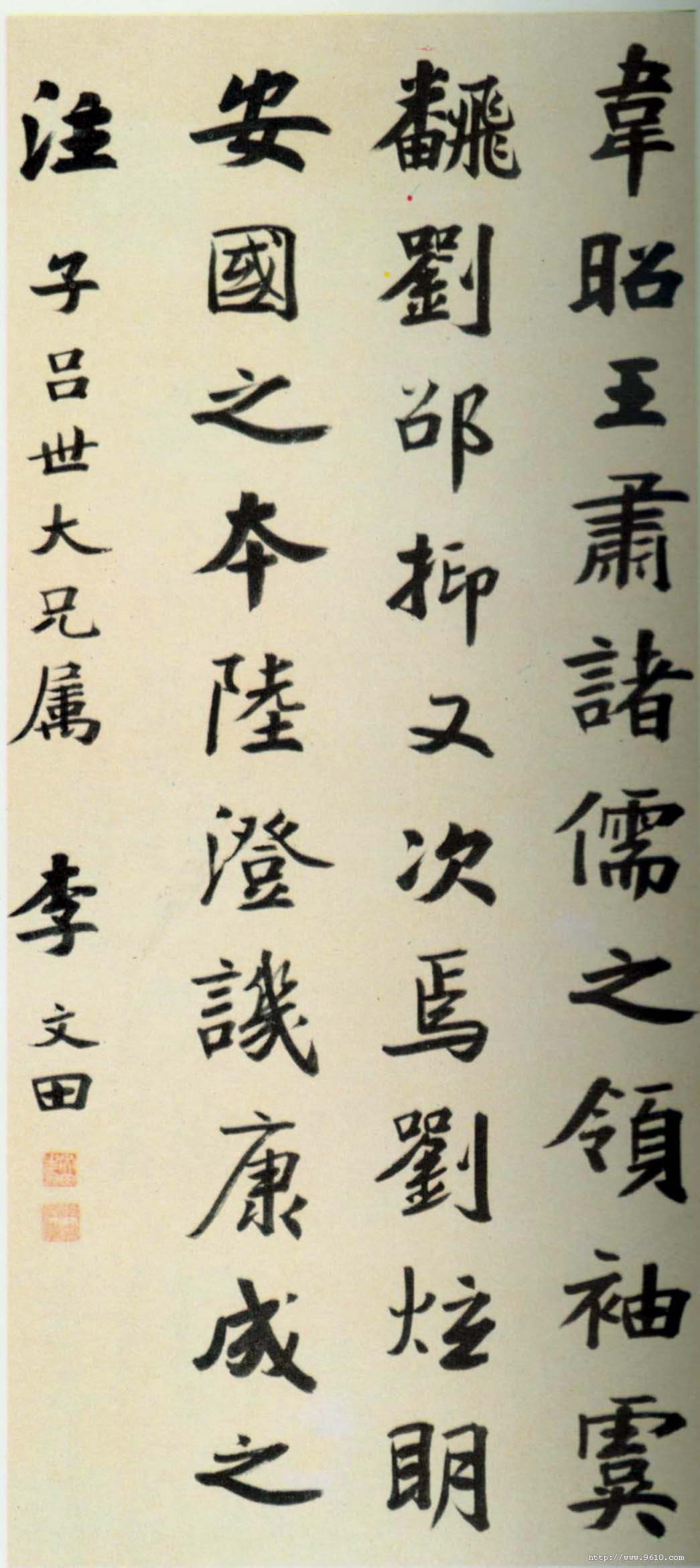 李文田《赠子吕楷书语摘轴》 112×53cm 广州美术馆藏 释文: 韦昭,王肃,诸儒之领袖。虞翻,刘邵抑又次焉。刘炫明安国之本,陆澄讥康成之注。 子吕世大兄嘱,李文田。 李文田书法初学欧阳询,后取法北碑,中晚年有较大变化,成为北碑书派中重要一员。此楷书是欧书与北碑书融合之作,而又参以行法,笔画挺实而流动,结字变化较大,不甚固定,是其书风过渡时期之作。 参考《中国书法全集》第76卷清代名家卷三(可嘉扫描)