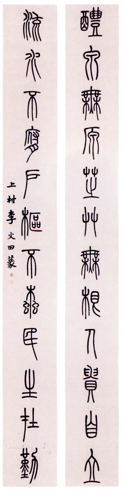 李文田《篆书十二言联》 245×29cm ×2 广东省顺德区博物馆藏 【释文】:醴泉无原,芝草无根,人贵自立,流水不腐,户枢不蠹,民生在勤。 来自《李文田书法集》(顺德区博物馆编印)