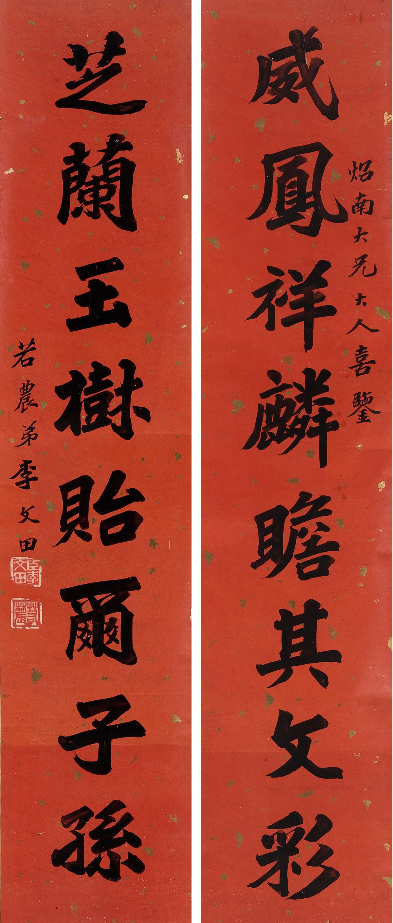 李文田《楷书威凤芝兰八言联》纸本楷书 159×33.8cm×2 澳大利亚新南威尔士州美术馆藏 释文:威凤祥麟瞻其文彩,芝兰玉树贻尔子孙。 款署:炤南大兄大人喜鉴。若农弟李文田。 钤印:臣李文田(朱文)、若农(白文) 【资料来源】 资料来自澳大利亚新南威尔士州美术馆网站