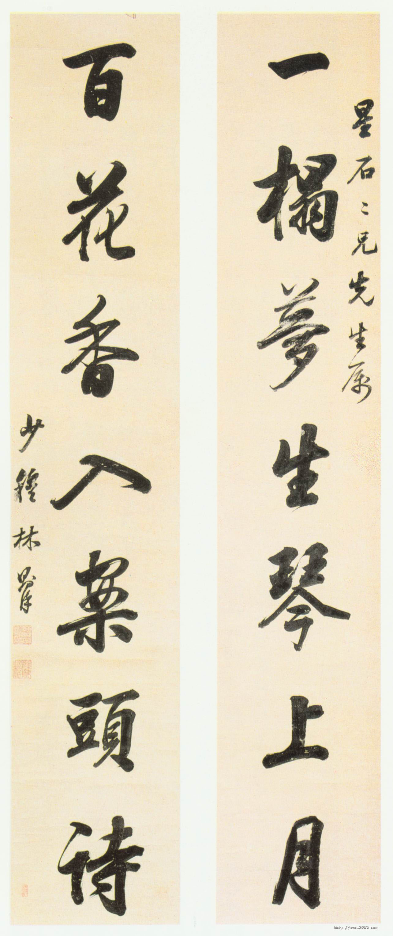 释文:一榻梦生琴上月,百花香入案头诗。 款署:星石二兄先生属。少穆林则徐。 钤印:臣林则徐字少穆印(白文) 鉴藏印:药农平生真赏(朱文)。