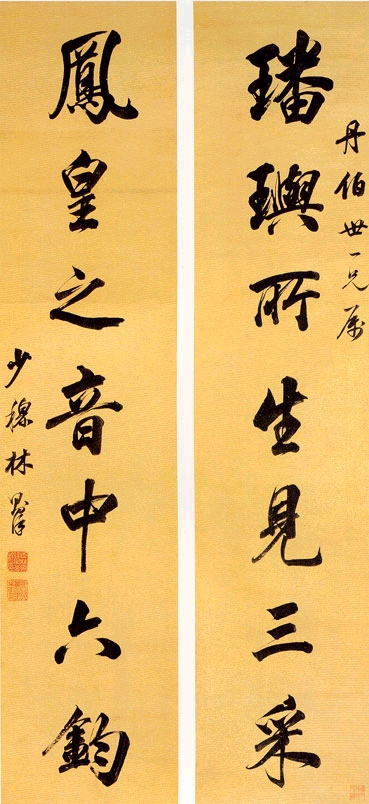 释文:璠玙所生见三采,凤皇之音中六钧。 款 识:丹伯世一兄属。少穆林则徐。 钤印:臣林则徐字少穆印(白文)、身行万里半天下(朱文) 收藏印:德门吕氏所藏(朱文
