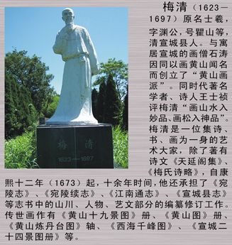 黄山,以它瑰伟奇特的丰姿,自古来吸引无数文人骚客为之折腰咏叹;黄山,以它云谲波诡的神韵,吸引着历朝历代无数画家为其挥毫泼墨。清初画坛上,就有这样一批画家,他们长期深入黄山、师法黄山、表现黄山,这里面有为后世景仰的国画宗师梅清、石涛、梅庚、梅翀、梅蔚、戴本孝等,后人把他们称做“黄山画派”,(也有专家学者把它命名为“宣城画派”。)其中,梅清更是被誉为“黄山画派”巨匠。
