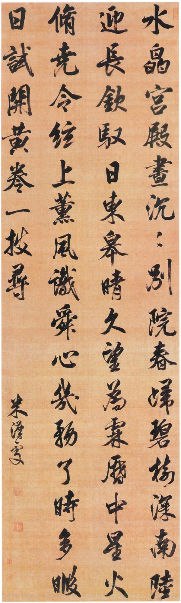 清 米汉雯《行书七律诗轴》绢本行书 216×63.8cm 天津博物馆藏 释文:水晶宫殿昼沉沉,别院春归碧树深。南陆迎长钦驭日,东皋晴久望为霖。历中星火修尧令,弦上薰风识舜心。几务了时多暇日,试开黄卷一披寻。 款署:米汉雯。