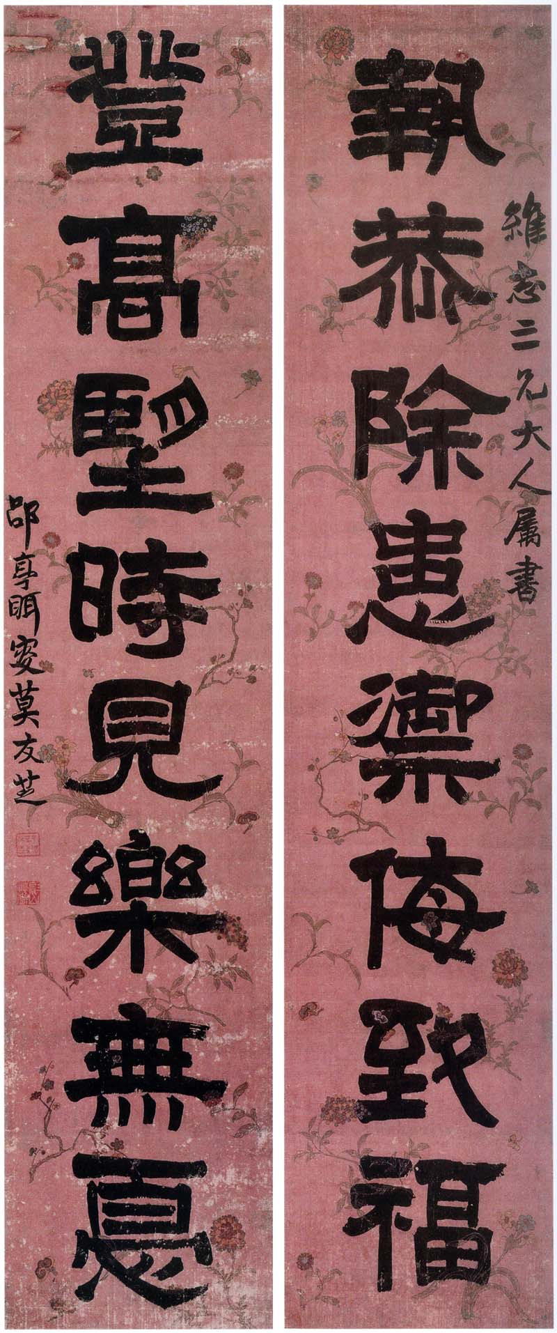 莫友芝《隶书执恭登高八言联》 色绢隶书 160.8×32.7cm×2 贵州省博物馆藏