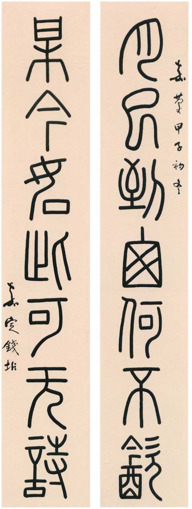 钱坫《篆书月已梅今七言联》纸本篆书 168.4×31.1cm×2 清华大学美术学院藏 释文:月已到西何不饮,梅今如此可无诗。 款署:嘉庆甲子初冬,嘉定钱坫。