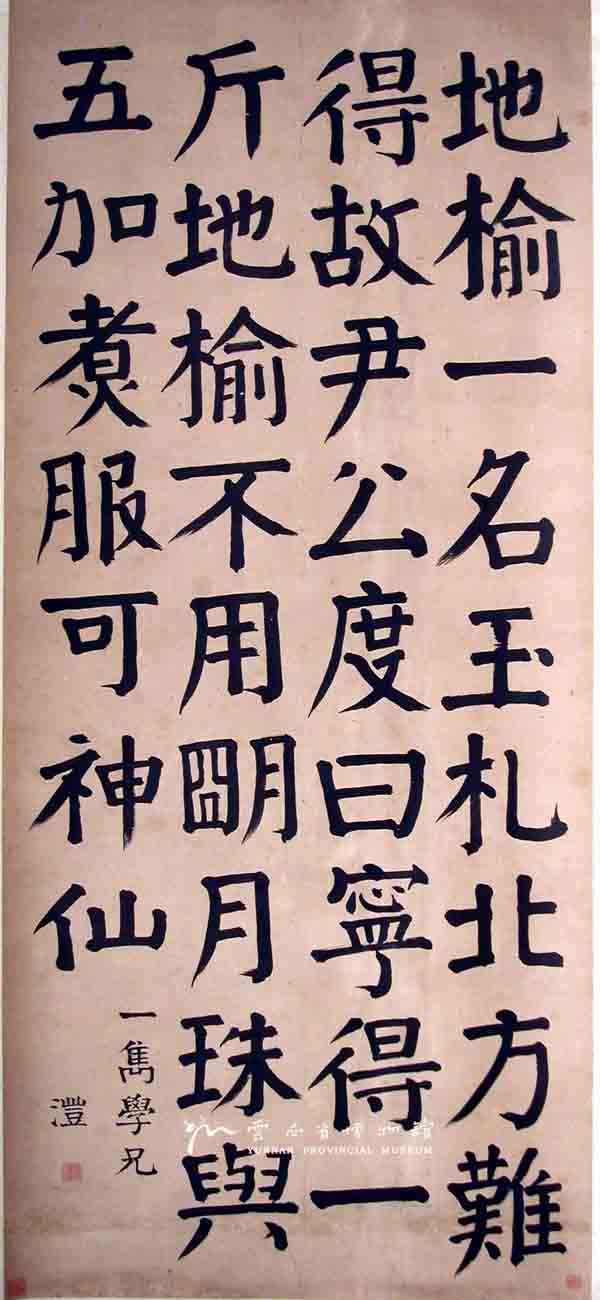 钱沣楷书,结体严整开阔,结字方正宽博,他的书法技艺被世人誉为几百年来学颜最的争意。钱沣以其俊拔的笔力和透着阳刚之美的书风,在中国书坛上占有一席之地。此幅楷书挺劲横拙,力道沉郁,比比不苟,得颜真卿神韵。以上资料来自云南省博物馆网站