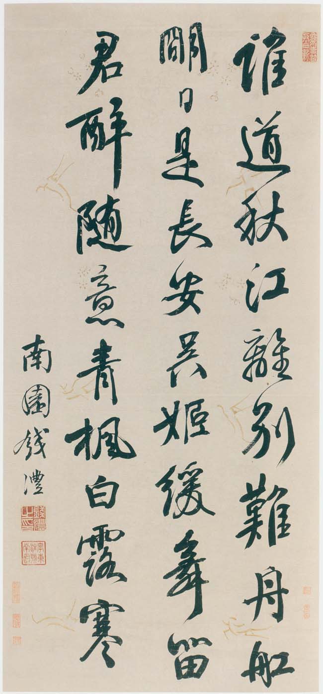 释文:谁道秋江离别难,舟船明日是长安。吴姬缓舞留君醉,随意青枫白露寒。 款署:南园钱沣。 钤印:勉力时习,孜孜日新(白文)、钱沣之印(白文)、字东注号南园(朱文) 【资料来源】《天津博物馆藏书法》(文物出版社出版)