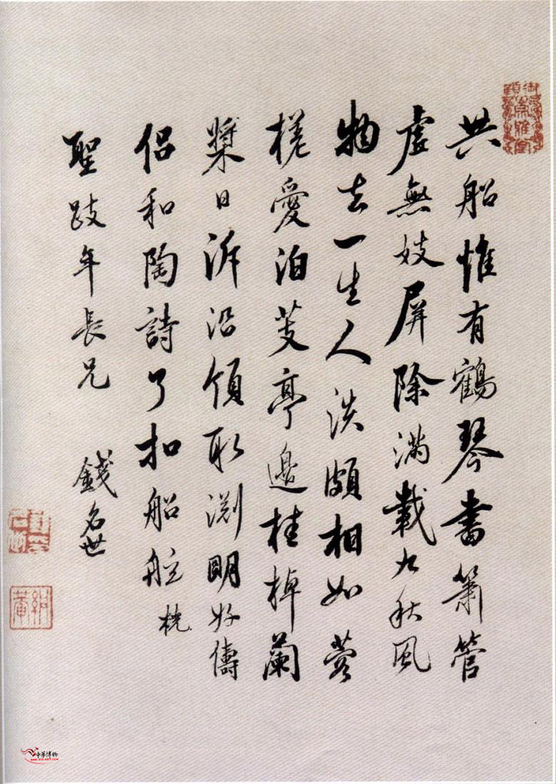 释文: 共船惟有鹤琴书,箫管虚无妓屏除。满载九秋风物去,一生人淡颇相如。 蓉槎爱泊芰亭边,桂棹兰(桨)[桡]日溯沿。领取渊明好俦侣,和陶诗了扣船舷。 圣跂年长兄 钱名世