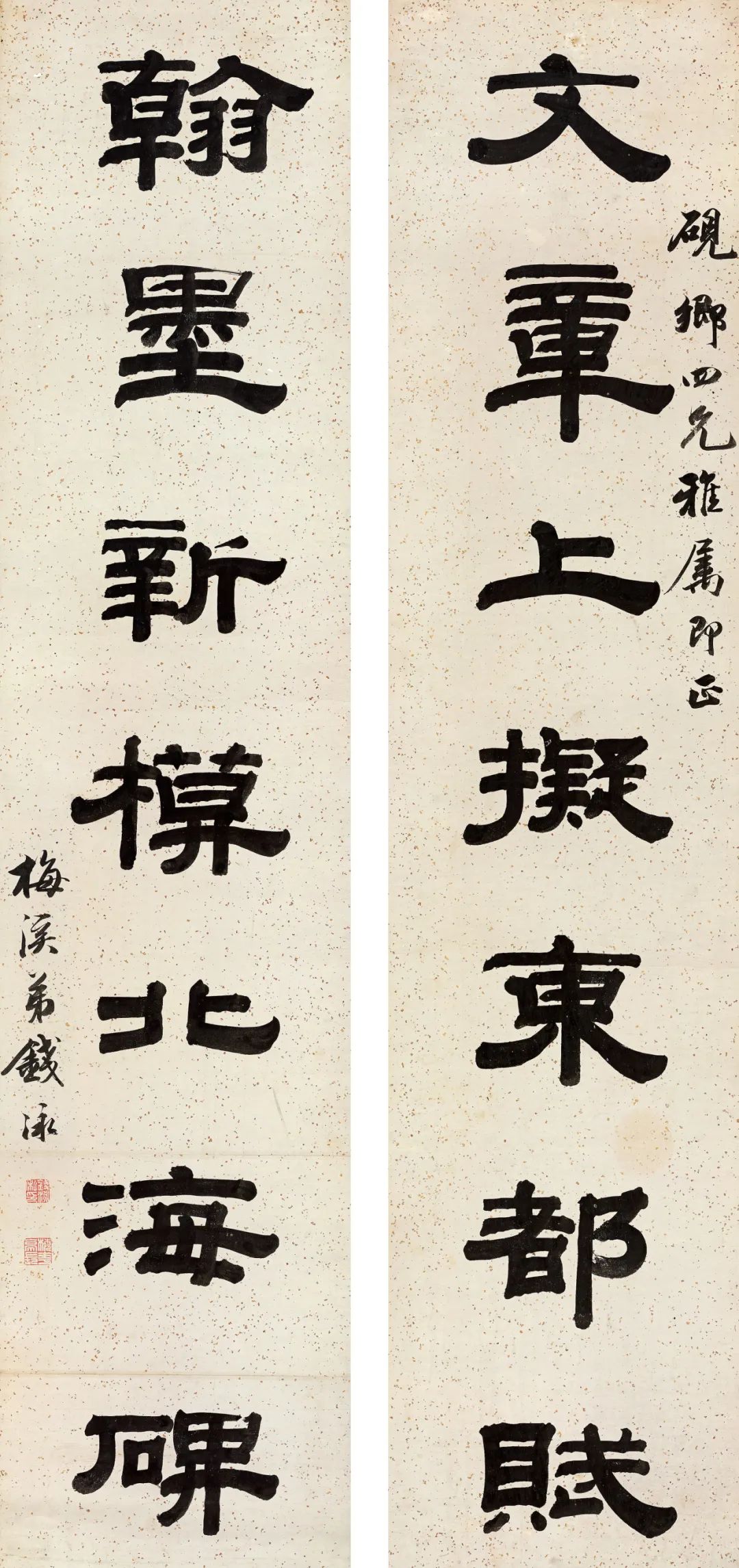 钱泳 《隶书“文章翰墨”七言联 》金笺 隶书 130×29.7cm×2 江苏省美术馆藏 释文:文章上拟东都赋,翰墨新模北海碑。 款识:砚乡四兄雅属即正,梅溪弟钱泳 钤印:钱泳私印(白)梅花亭长(白) 【资料来源】江苏省美术馆《书道中兴·清代书法演进之路》2023.9.23-10.29