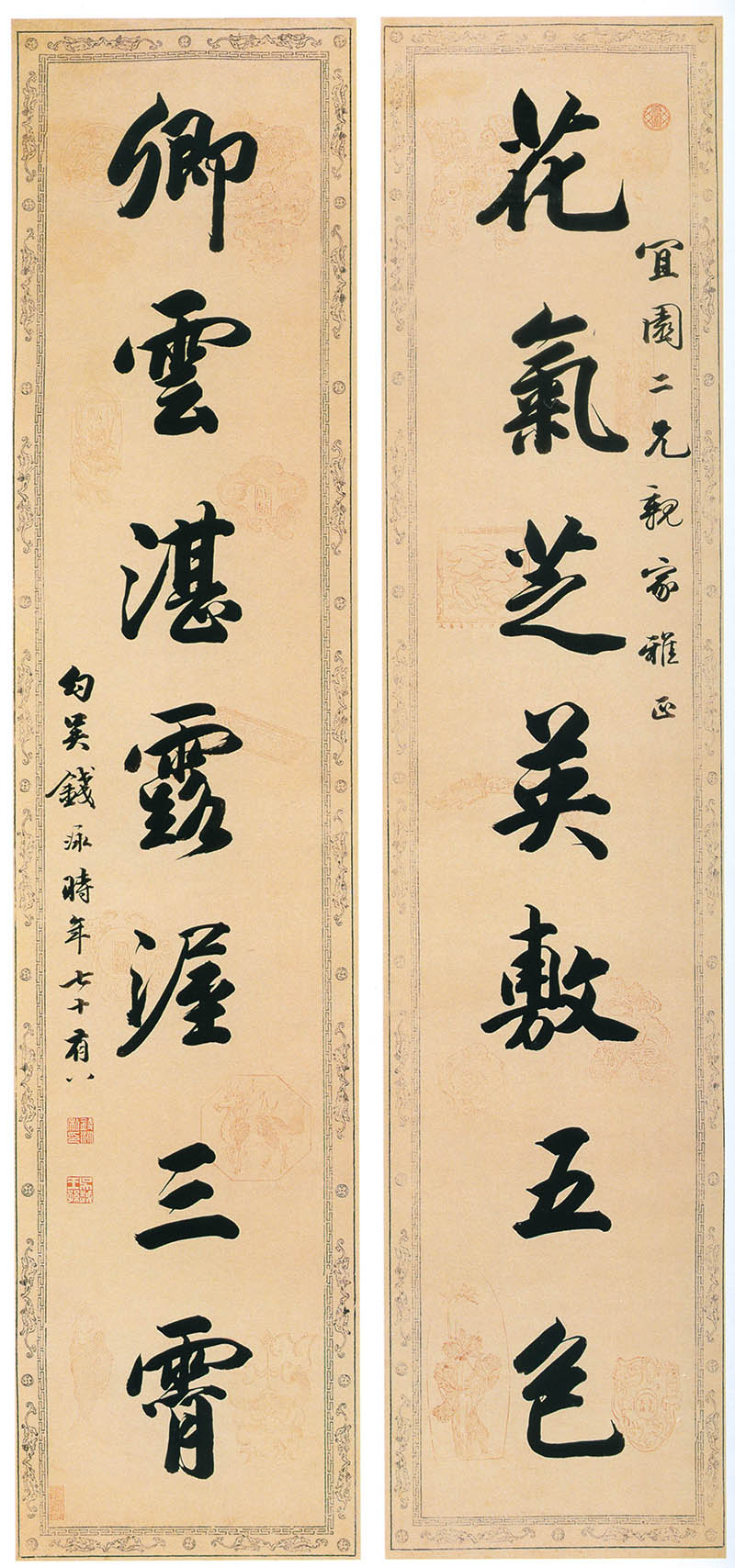 钱泳 《行书“花气卿雲”七言联 》纸本行书 132×29cm×2 朵云轩藏 释文:花气芝英敷五色,卿雲湛露渥三霄。 款识:宜园二兄亲家雅正,勾吴钱泳,时年七十有八。 钤印:钱泳私印(白)吴越王孙(白) 【资料来源】《中国法书全集》17-清-2(文物出版社)
