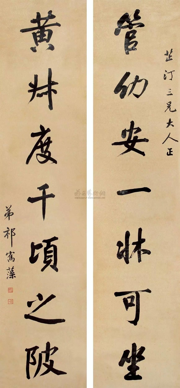 祁寯藻《行书管幼黄叔七言联》立轴 167×37cm×2 释文:管幼安一床可座。黄叔度千顷之陂。 款识:芷汀三兄大人正。弟祁寯藻。