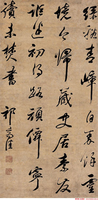 祁豸佳书法大轴“绿溪青山白素……”(140X59),纸色若米汤暗透,更是显出三百年的古艳。墨浓如漆,行笔的墨痕上尽显“墨霜”,(古书画墨迹方有此包浆,在古家俱中称为“结灰”)。诗为祁氏自作,印文也为祁氏常用印。(见《中国书画家印鉴款识》)。其用笔流畅中又带生拙,下笔肯定,锋的使转清楚地看到游丝缠绕与提按,按到三分笔肚的抽毫更具老辣。“嶂”“史”“素”的入笔干净利落,学帖的人深知此用笔之难,入后转锋毫无轻佻浮滑之相。此非瞬间不期而至的效果,而是熟后生的涵养与技法的升腾。总体结字沉雄宽博,字距间欹斜反正,从容不迫。“嶂”、 “归、”“仙、”“宁”四字的笔划拉长,在不经意中纵敛开合仿毫不突兀。这种气势开张、阔大雄浑的章法充分体现了作者的气度与胸襟。此种风格与《历代书法墨迹大观》(上海书店出版)如出一辙,属典型的祁氏风格。又经清代吴云、民国吴湖帆两巨眼鉴定为真迹无疑。从结字、用笔来剖析,祁氏对二王、颜鲁公、米南宫、苏轼着力最多。在明代晚期书坛上论者以为祁豸佳书法比肩董其昌。从纯艺术本体着眼,祁的艺术地位不能与董等量齐观,但在大幅书法的表现力上,董其昌稍觉滑熟。祁豸佳的朋友倪云璐的用笔是够“杀纸”,他们都是风骨之士,书如其人,心正刚笔正,董其昌输在气格与胸襟上。艺术史上的地位董其昌影响有清一代,而在人格上与祁豸佳有宵壤之别,显得卑微了。