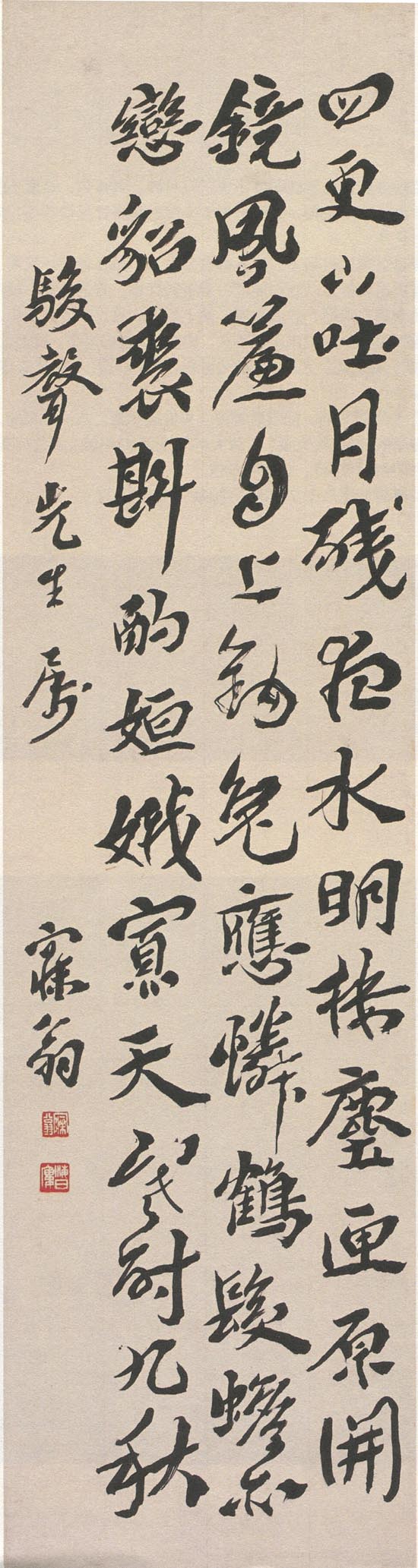 沈曾植《行书杜甫月诗轴》纸本行书 134×33cm 浙江省博物馆藏 释文:四更山吐月,残夜水明楼。 尘匣元开镜,风帘自上钩。 兔应疑鹤发,蟾亦恋貂裘。 斟酌姮娥寡,天寒耐九秋。 款署:骏声先生属,寐翁。 钤印:寐翁(白文)、海日楼(白文) 【资料来源】《海日流光》(中华书局)