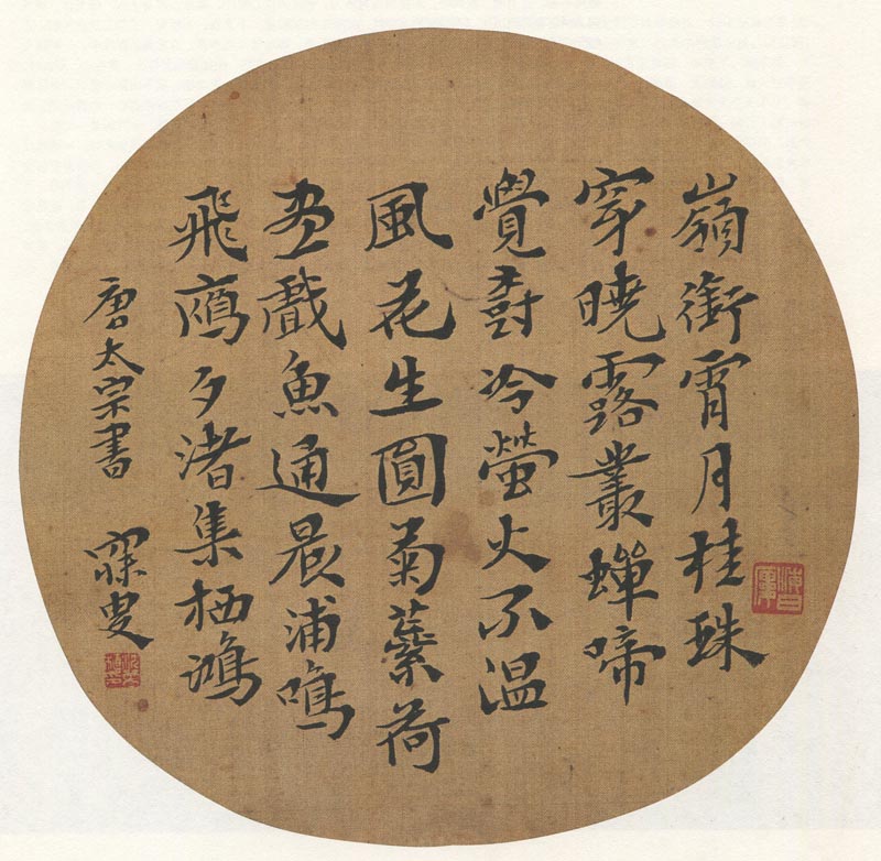 释文:岭衔霄月桂,珠穿晓露丛。蝉啼觉树冷,萤火不温风。花生圆菊蕊,荷尽戏鱼通。晨浦鸣飞雁,夕渚集栖鸿。