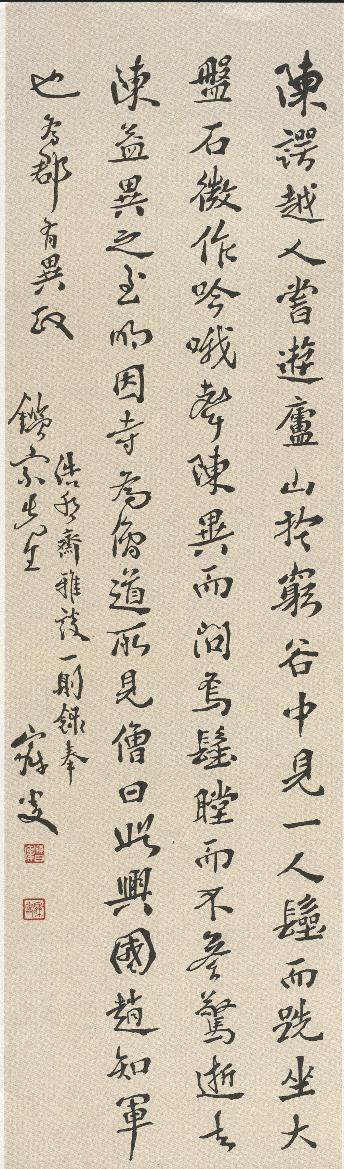 沈曾植《行书录周密浩然斋雅谈语轴》纸本行书 148.5×40.6cm 杭州博物馆藏 释文:陈谔,越人,尝游庐山,于穷谷中见一人,髽而跣坐大盘石,微作吟哦声。陈异而问焉,髽瞠而不答,惊逝去。陈益异之,至明因寺,为僧道所见,僧曰:“此兴国赵知军也。为郡有异政。” 款署:《浩然斋雅谈》一则,录奉鉴宗先生,寐叟。 钤印:海日楼(白文)、寐叟(朱文) 【资料来源】《海日流光》(中华书局)