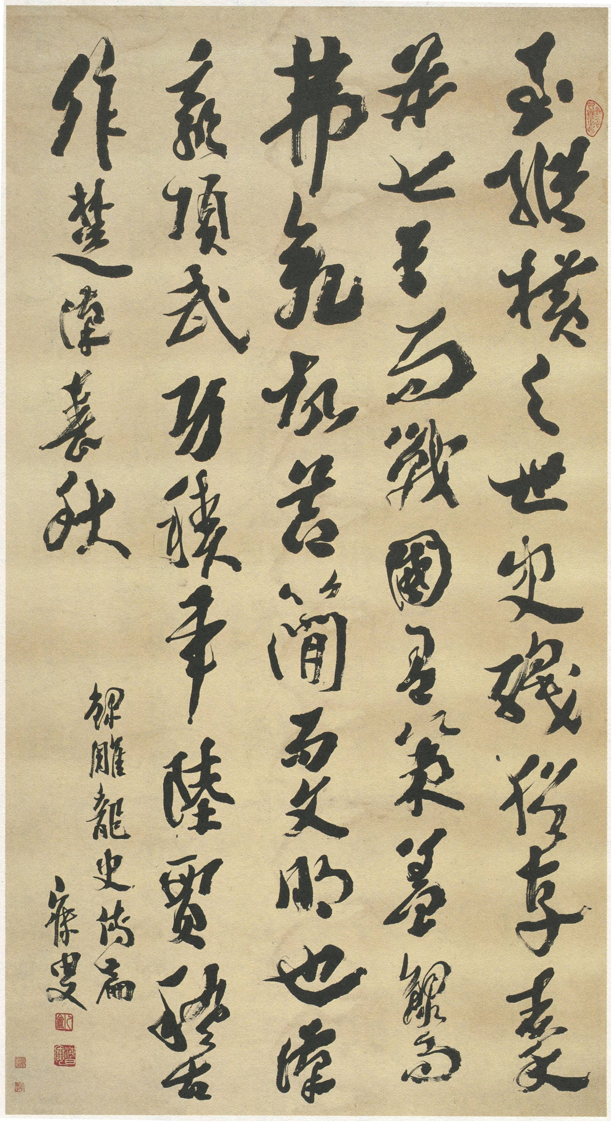 沈曾植《节录文心雕龙史传篇文轴》纸本行草书 146.7×79.5cm 浙江省博物馆藏 释文:至纵横之世,史职犹存。秦并七王,而战国有策。盖录而弗叙,故即简而文明也。汉嬴项,武功积年。陆贾稽古,作《楚汉春秋》。 款署:录《雕龙史传篇》,寐叟。 钤印:乙盦(朱文)、海日楼(白文)、知一念即无量劫(朱文) 【资料来源】《海日流光》(中华书局)