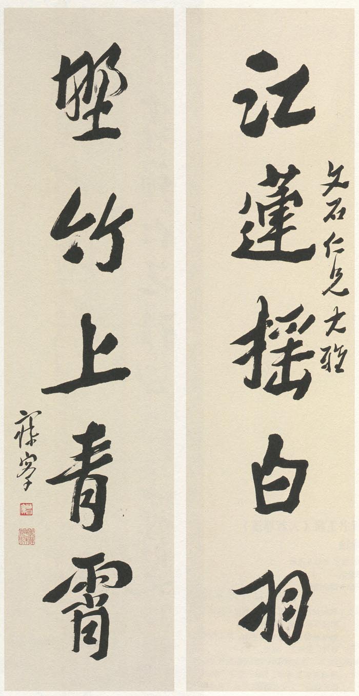 沈曾植《行书江莲野竹五言联》纸本行书 134×33cm×2 平湖市博物馆藏 释文:江莲摇白羽,野竹上青霄。 款署:文石仁兄大雅,寐叟。 钤印:海日楼(白文)、象莲花未开形(朱文) 【资料来源】《海日流光》(中华书局)