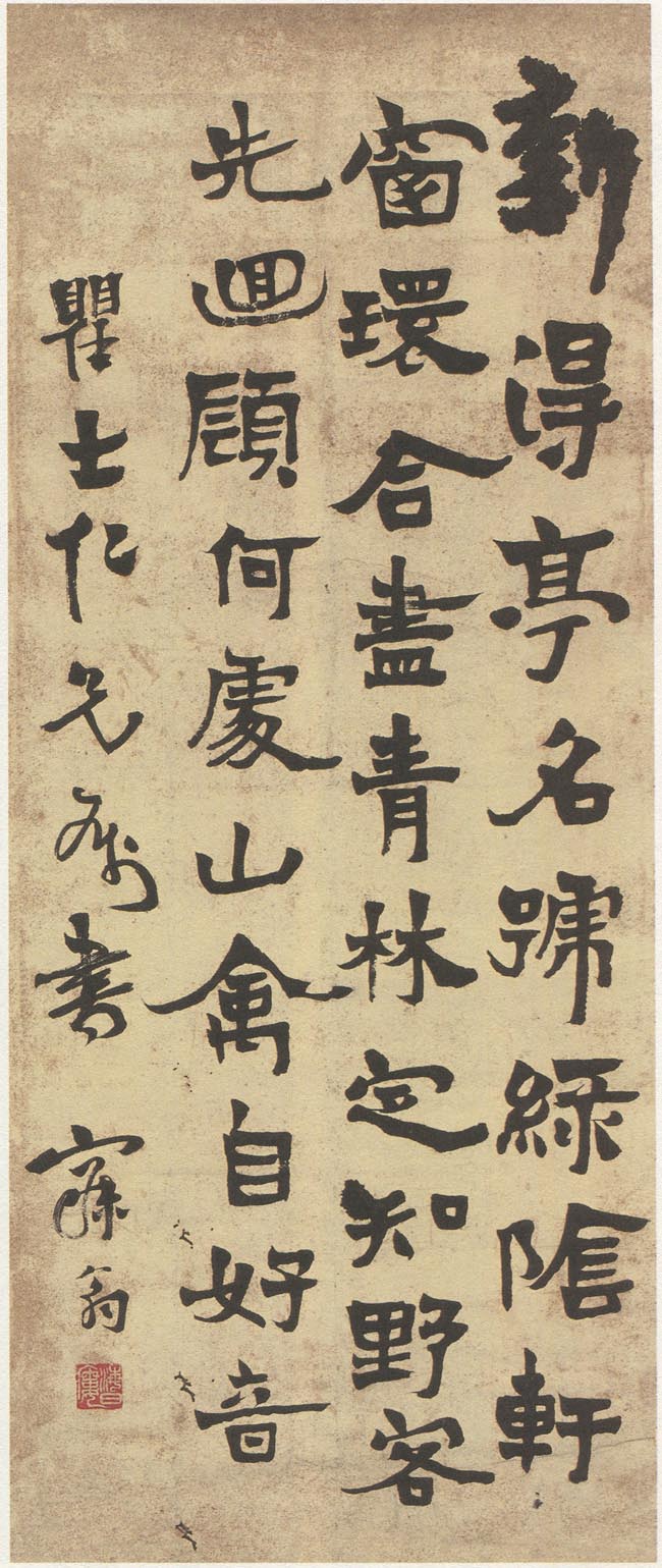 沈曾植《行楷韩维题卞大夫翠阴亭诗轴》纸本行楷书 98×39cm 瑞安市文物馆藏 释文:新得亭名号绿阴,轩窗环合尽青林。定知野客先回顾,何处山禽自好音。 款署:瞿士仁兄属书,寐叟。 钤印:海日楼(白文) 【资料来源】《海日流光》(中华书局)