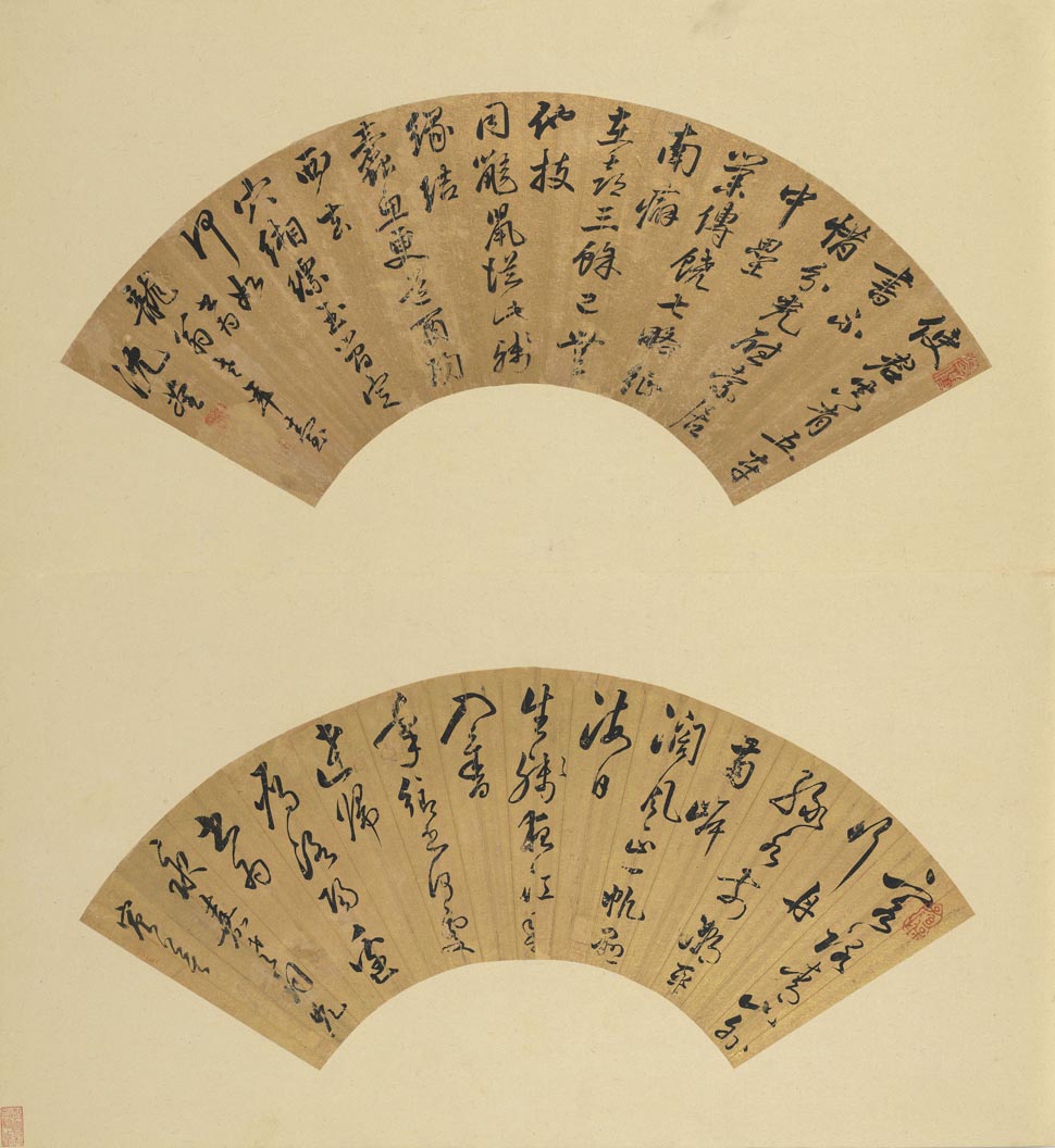 沈荃《行书七律扇面》(上)纸本行书 16.4×51.8cm 台北故宫博物院藏 释文:使君真有五车书。不惜分光慰索居。中垒业传饶七略。征南癖在喜三餘。已无他技同鼯鼠。从此残缘结蠹鱼。更道酉阳西去穴。緗縹玉简定何如。 款识:书為龙翁老年臺。沈荃。 钤印:墨仙、沈□、(一印漫漶) 【资料来源】台北故宫博物院资源开放平台(故-書-000944-00031 名人書扇(子) 册 清沈荃書扇)