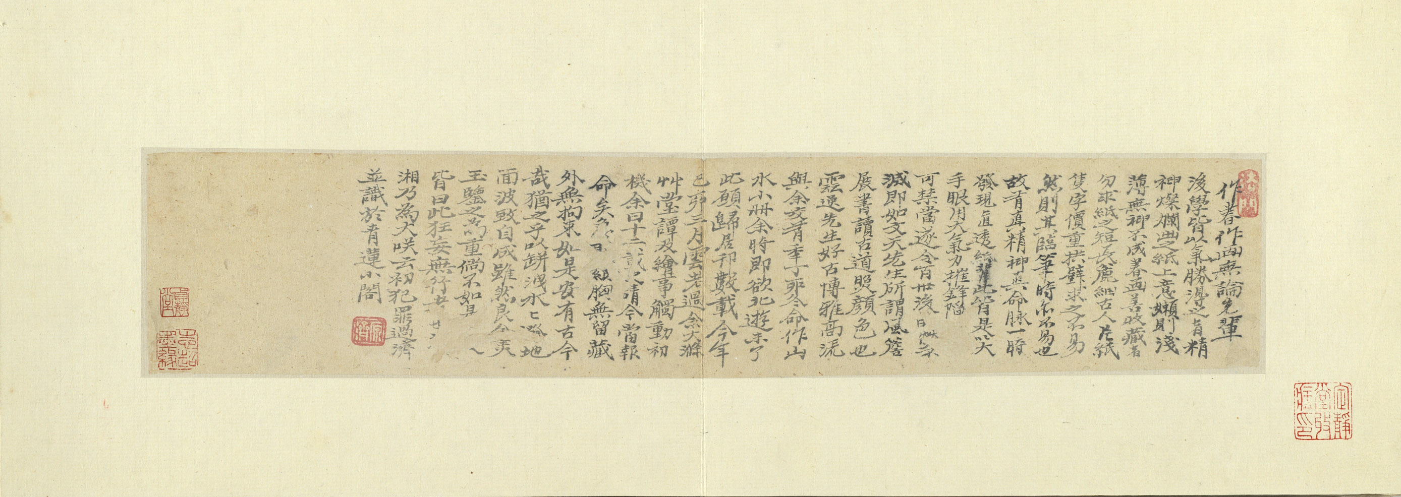 释文:作书作画无论先辈后学皆以气胜。得之旨精神灿烂。出之纸上。意嬾则浅薄无神。不成书画。善收藏者勿求纸之短长麤细。古人片纸隻字价重。拱璧求之不易。然则其临笔时亦不易也。故有真精神真命脉。一时发现直透纸背。此皆是以大手眼。用大气力摧锋陷□□可禁当遂令。百世后□□灭。即如文天先生所谓。风簷展书读。古道照顏色也。雲逸先生好古博雅高流与余交有年。丁卯冬命作山水小册。余时即欲北游未了。此愿归居?数载。今年己卯三月雲老过余大涤草堂。谭及绘事。触动初机。余曰十二载之请。今当报命矣。急□□胸无留藏。外无拘束。如是安有古今哉。犹之乎以缾洩水。水泼地面。波致自成。虽然良□(金)美玉。鉴之為重。倘不如是□□。皆曰此狂妄无行者□□。湘乃為大咲云。初犯罪过。济并识於青莲小阁。