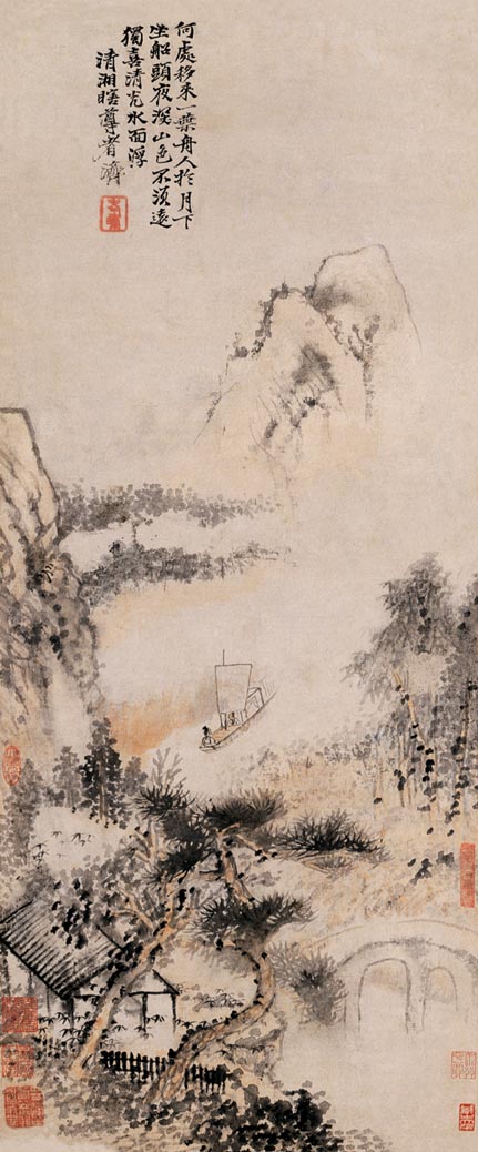 [清]石涛 月夜泛舟图 轴 82.2×34.8cm 纸本设色 上海博物馆藏