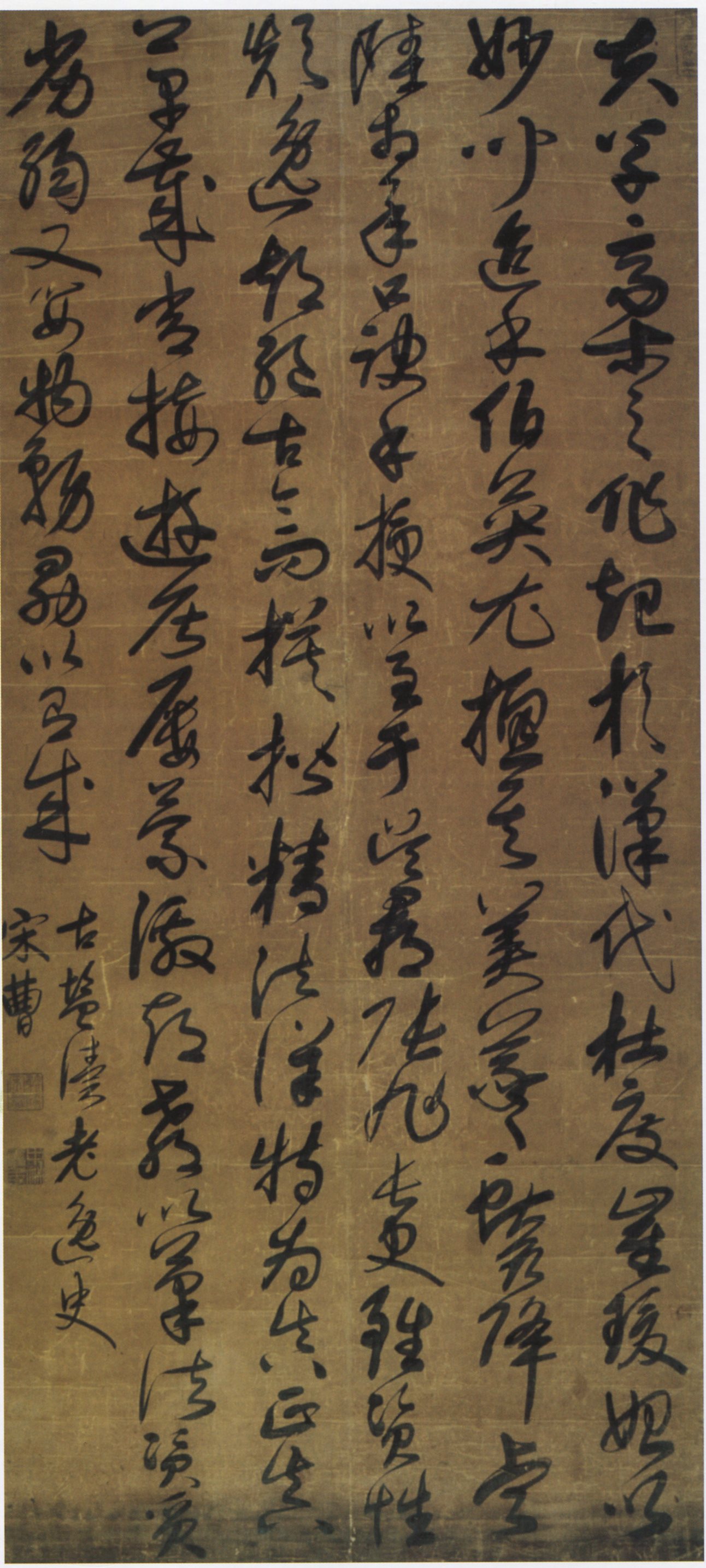 宋曹《录怀素自叙帖句轴》绫本行草 182×86.7cm 山东省博物馆藏 释文:夫草稿之作,起于汉代。杜度、崔瑗,始以妙闻;逮乎伯英,尤擅其美。羲、献兹降,虞、陆相承,口诀手授,以至于吴郡张旭长史。虽姿性颠逸,超绝古今,而模楷精详,特为真正。真卿早岁,常接游居,屡蒙激昂,教以笔法。资质劣弱,又婴物务,不能恳习,迄以无成。 款署:古盐渎老逸史。宋曹。