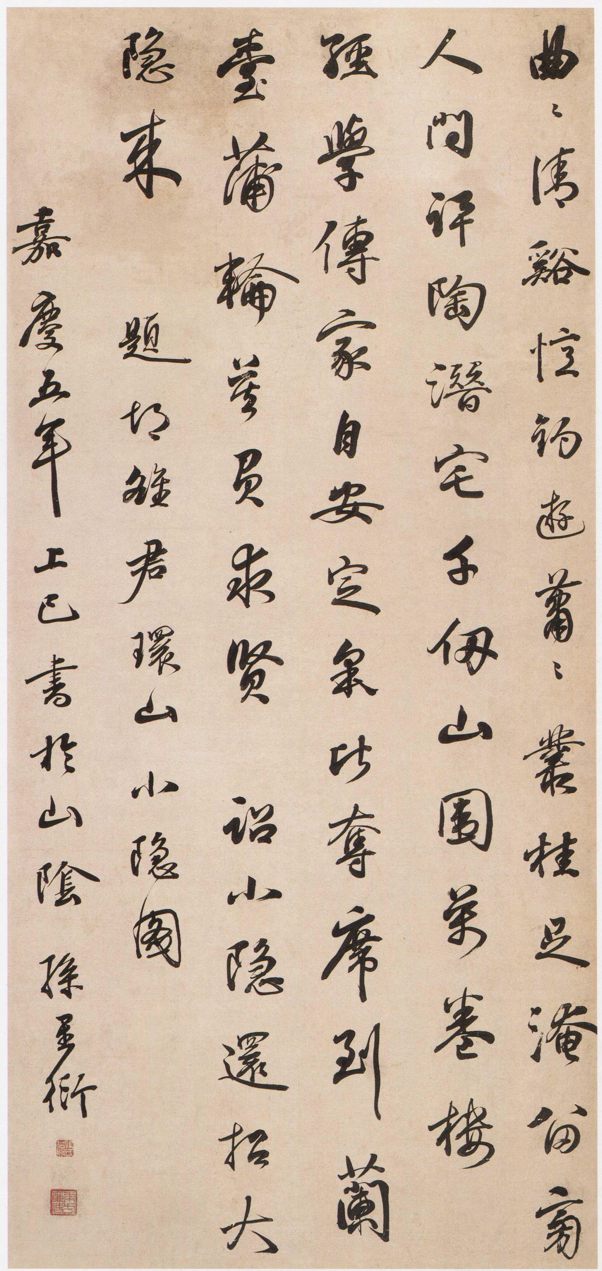 释文:曲曲清谿忆钓游,萧萧丛桂足淹留。旁人问讯陶潜宅,千仞山围万卷楼。经学传家自安定,皋比夺席到兰台。蒲轮莫负求贤诏,小隐还招大隐来。 款署:题胡雒君环山小隐图,嘉庆五年上巳书于山阴。孙星衍。 钤印:孙伯渊氏(白文)、东方廉使(朱文) 【资料来源】《翰墨清芬》——浙江省博物馆典藏大系(浙江古籍出版社)