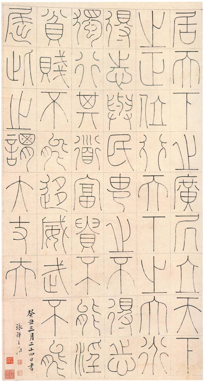 是轴字体规正,运笔劲健,风格俊逸,為玉筋篆体的佳作。此轴书於“癸丑三月”,钤“王澍印”、 “恭寿”两印。癸丑為雍正十一年(1733),作者时年六十五岁。