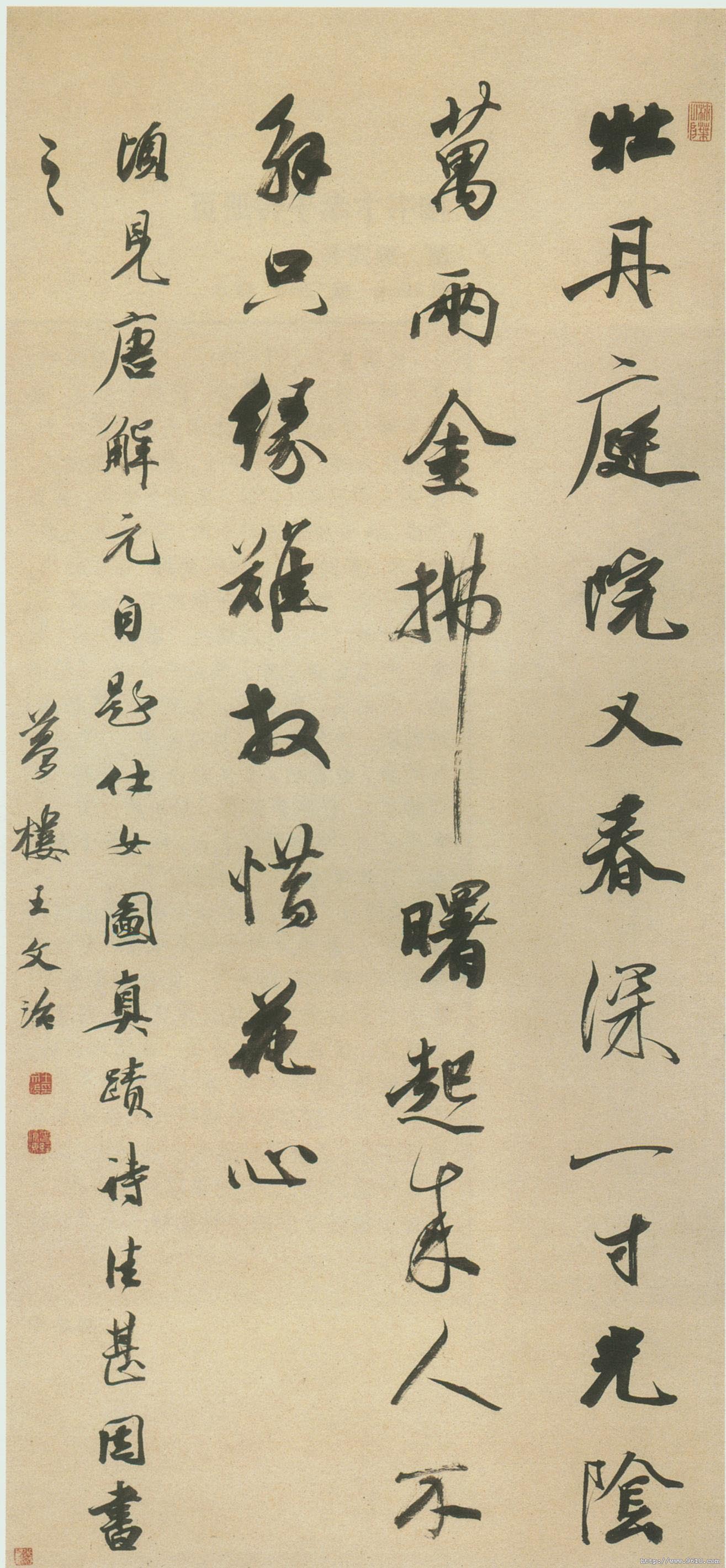 释文:牡丹庭院又春深,一寸光阴万两金。拂曙起来人不解,只缘难放惜花心。 顷见唐解元自题仕女牡丹图真迹诗佳甚因书之。梦楼王文治。 资料来自《西泠印社百年社藏精品》(西泠印社出版社)