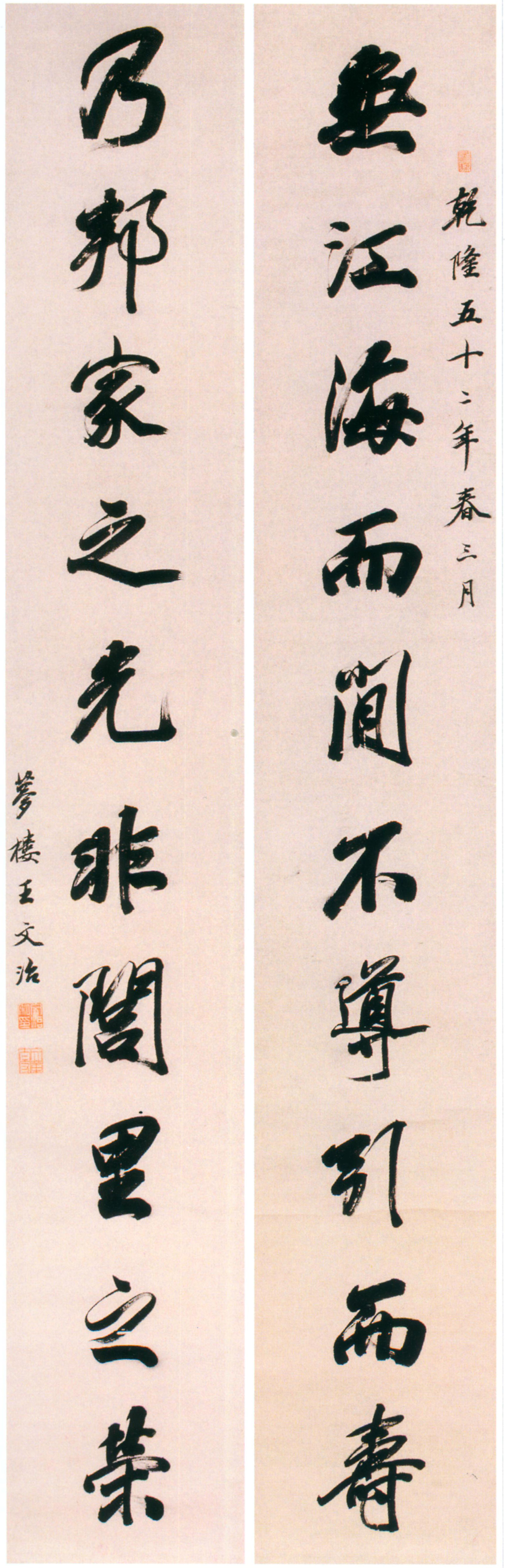 王文治《无江乃邦十言联》纸本行书 乾隆五十二年(1787)常州博物馆藏 释文:无江海而闲不导引而寿,乃邦家之光非闾里之荣。乾隆五十二年春三月。梦楼王文治。