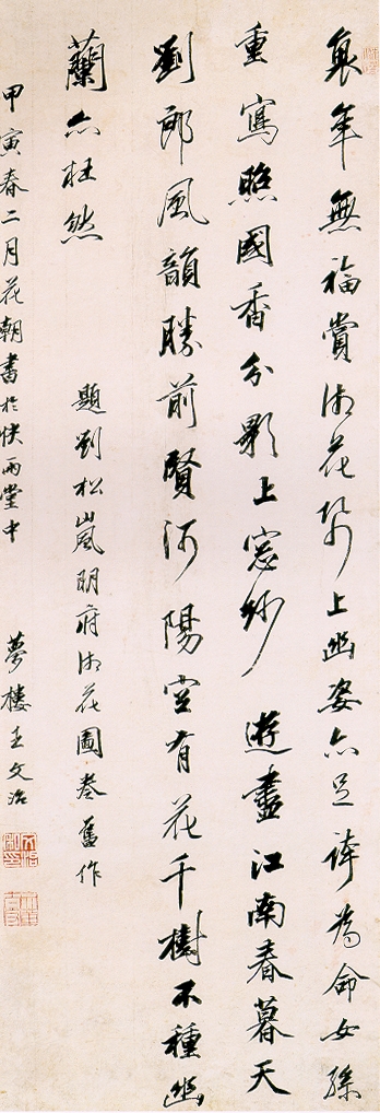 王文治《题刘松岚明府湘花图卷诗轴》 纸本行书 129×44.4cm 甲寅(1794年)作 上海博物馆藏 释文:衰年无福赏湘花,纸上幽姿亦足夸。为命女孙重写照,国香分影上窗纱。游尽江南春暮天,刘郎风韵胜前贤。河阳空有花千树,不种幽兰亦枉然。题刘松岚明府湘花图卷旧作。甲寅春二月花朝书于快雨堂中。梦楼王文治。 【资料来源】转自上海博物馆网站