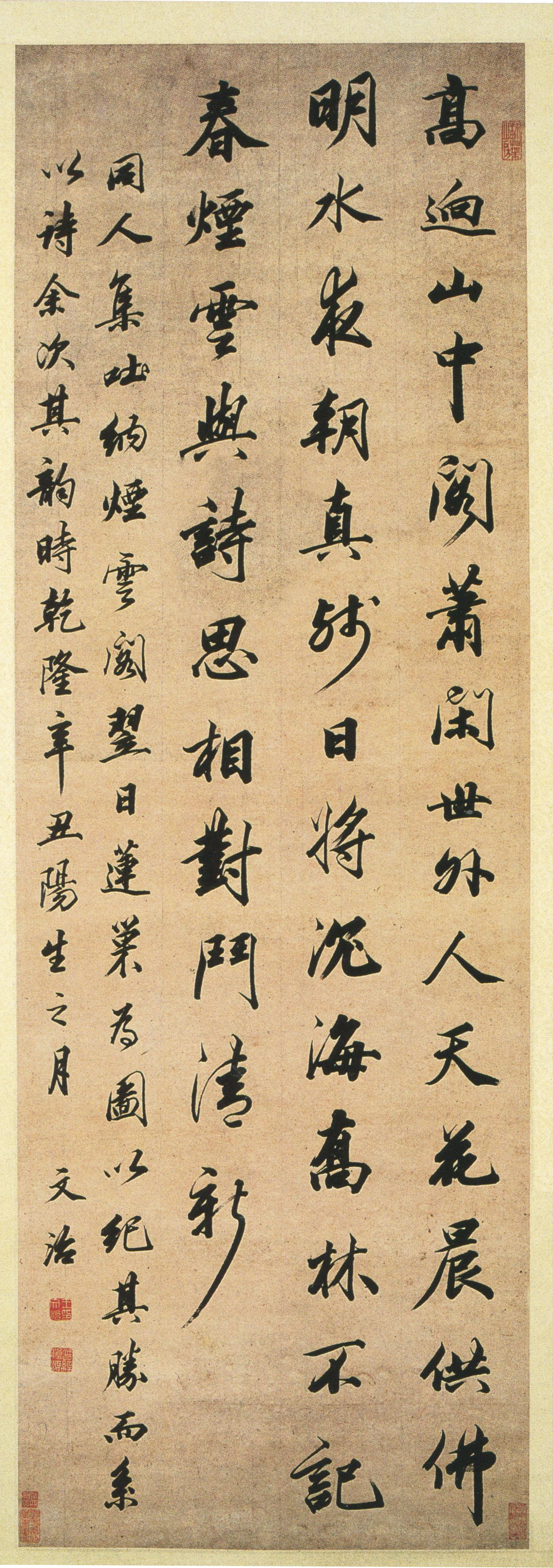 王文治《行书五律诗轴》 纸本行书 128.5×43.5cm 1781年作 湖南省博物馆藏 释文:高迥山中阁,萧闲世外人。天花晨供佛,明水夜朝真。残日将沉海,乔林不计春。烟云与诗思,相对斗清新。 款署:同仁即吐纳烟云阁,翌日莲巢为图,以纪其胜,而系以诗,余次其韵。时乾隆辛丑阳生之月。文治。 钤印:王文治印(白文)、曾经沧海(白文)