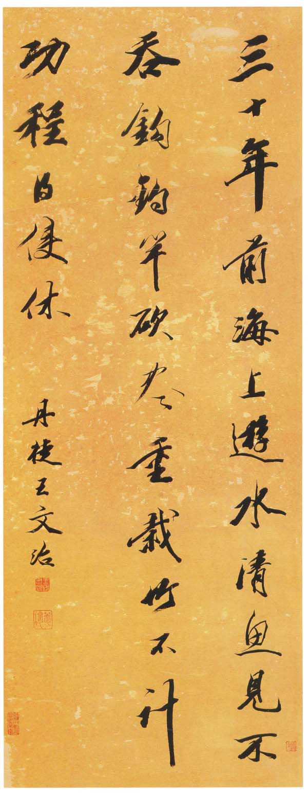 王文治《行书唐人七言禅诗轴》 纸本行书 90×34cm 云南省博物馆藏 释文:三十年前海上游,水清鱼儿不吞钩。钓竿砍尽重栽竹,不计功程得便休。 款署:丹徒王文治。 钤印:王文治印(白文)、梦楼(朱文)