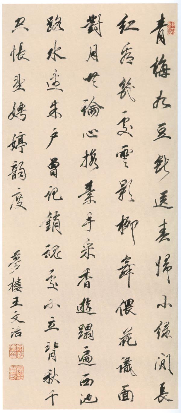 王文治《行书张震蓦山溪词轴》 纸本行书 93.50×40cm 湖南省博物馆藏 释文: 青梅如豆,断送春归。小绿间长红,看几处、云歌柳舞。偎花识面,对月共论心,携素手,采香游,踏遍西池路。 水边朱户。曾记销魂处。小立背秋千,空怅望、娉婷韵度。 款署:梦楼王文治。 钤印:文治私印(白文)、文章太守(朱文)