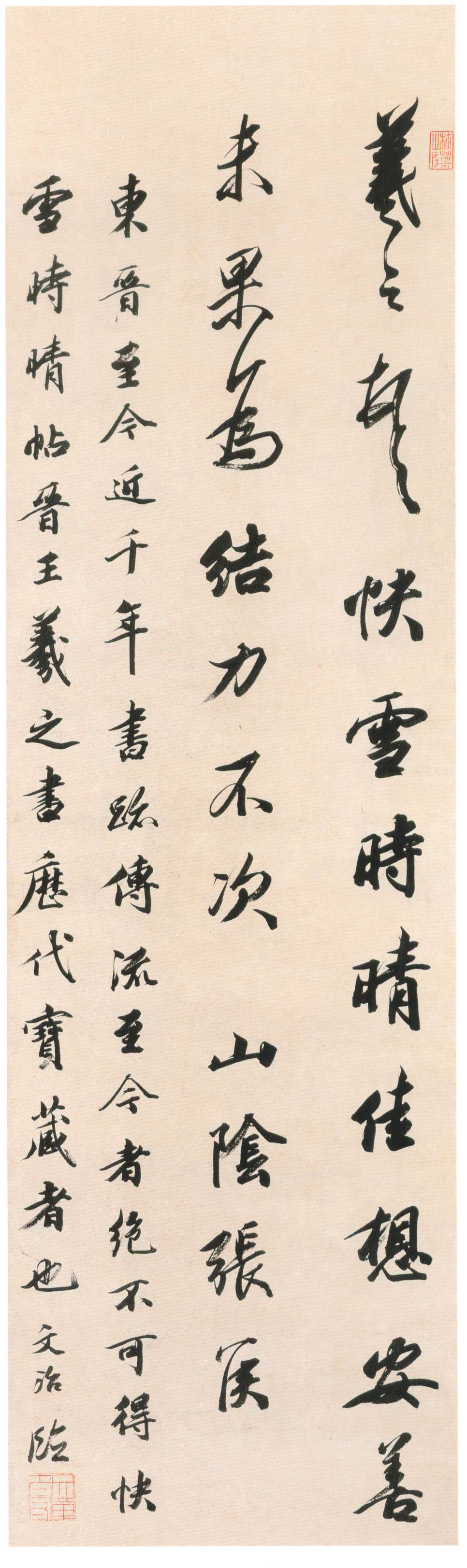 王文治《行书临快雪时晴帖轴》 纸本行书 128×37.5cm 深圳市博物馆藏 释文:羲之顿首,快雪时晴,佳想安善。未果为结。力不次。王羲之顿首。山阴张侯。 款署:东晋至今近千年,书迹传流至今者,绝不可得,快雪时晴帖,晋王羲之书,历代宝藏者也。文治临。 钤印:柿叶山房(朱文)、文章太守(朱文)