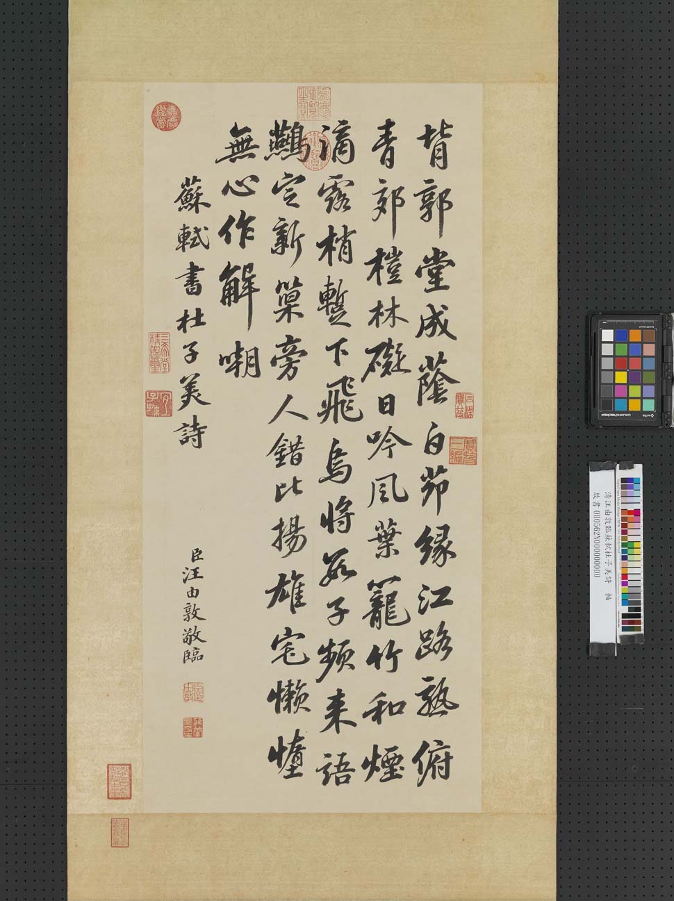 释文:背郭堂成蔭白茆。緣江路熟俯青郊。榿林礙日吟風葉。籠竹和煙滴露梢。蹔下飛烏將數子。頻來語燕?鳥定新巢。旁人錯比揚雄宅。懶惰無心作解嘲。蘇軾書杜子美詩。臣汪由敦敬臨。 款署:苏轼书杜子美诗,臣汪由敦敬临。 钤印:臣汪由敦(朱文)、葵藿是平生(白文)。 【参考来源】台北故宫博物院网站(故-書-000562-00000)