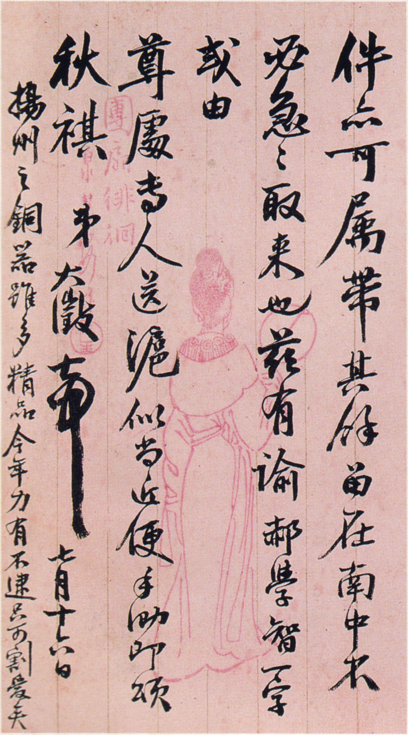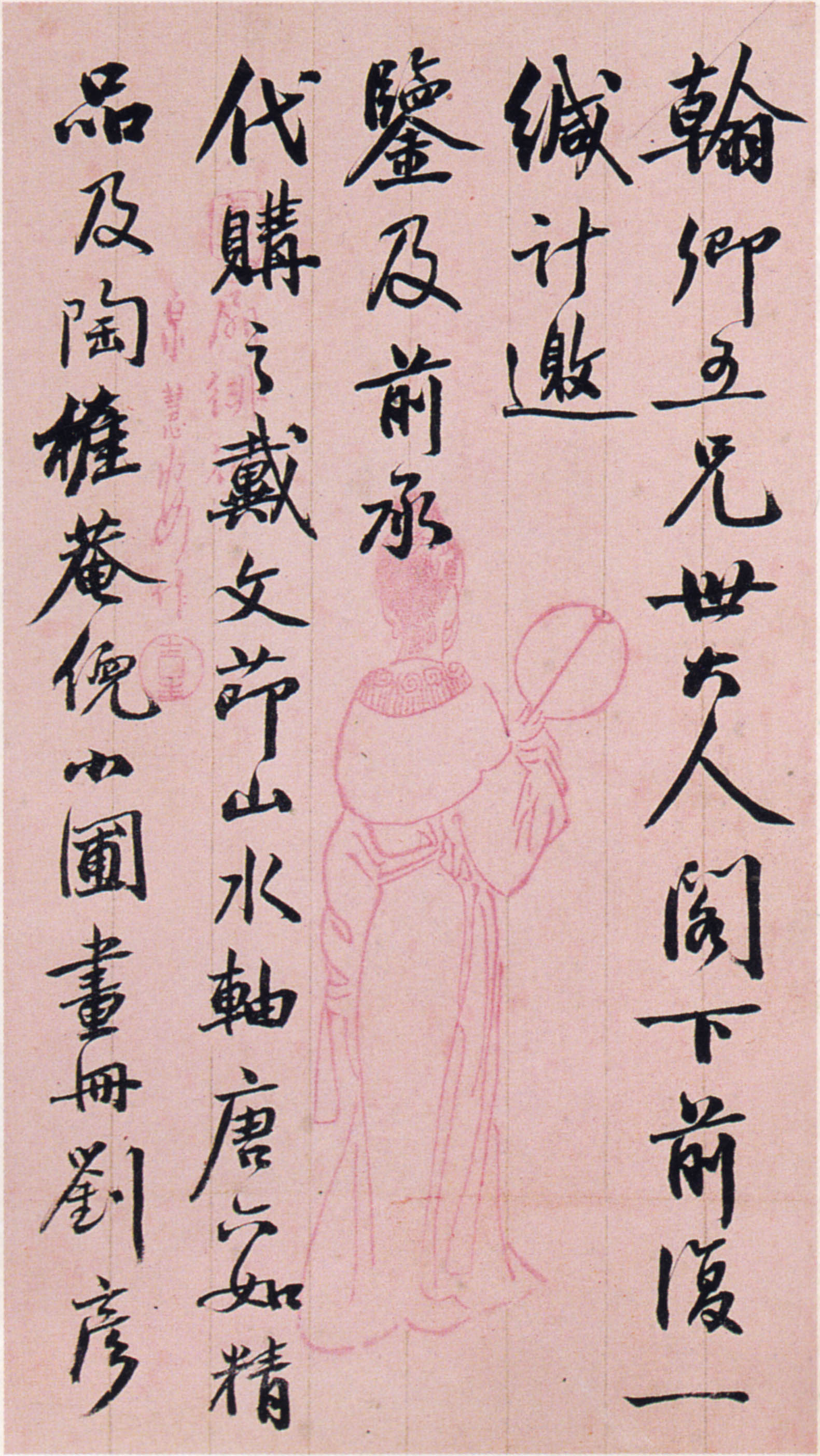 释文:翰卿五兄世大人阁下:前复一缄,计邀鉴及前承代购之戴文节山水轴、唐六如精品及陶 ?(木産)庵、倪小圃画册、刘彦冲画扇,乞寄上海,交广庵观察处,俟郝学智到沪,即可带回。(有病故画图委员灵柩,派郝弁送至上海,约八月初五后可到)因该弁尚有石印古玉图考一箱,少则尚可携带,画轴多,则恐不易带耳。古玉尊一件,亦可属带,其余留在南中,不必急急取来也。兹有谕郝学智一字,或由尊处专人送沪,似尚近便。手泐,即颂秋祺。弟 大澂顿首 七月十六日 ( 扬州之铜器虽多精品,今年力有不逮,只可割爱矣)