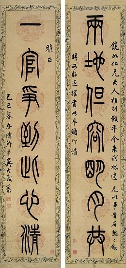 (图注:1869年暮春,吴大澂为镜如所书篆书对联,为邓石如书风的篆字。)